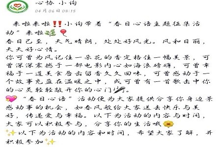 心理(生涯)发展服务中心于2021年4月6日至4月16日举办了“春日心语主题征集”活动。该活动在线上举行,为同学们提供广阔的发挥空间,2019级和2020级的同学积极参与,许多丰富多彩的创意得到展现。