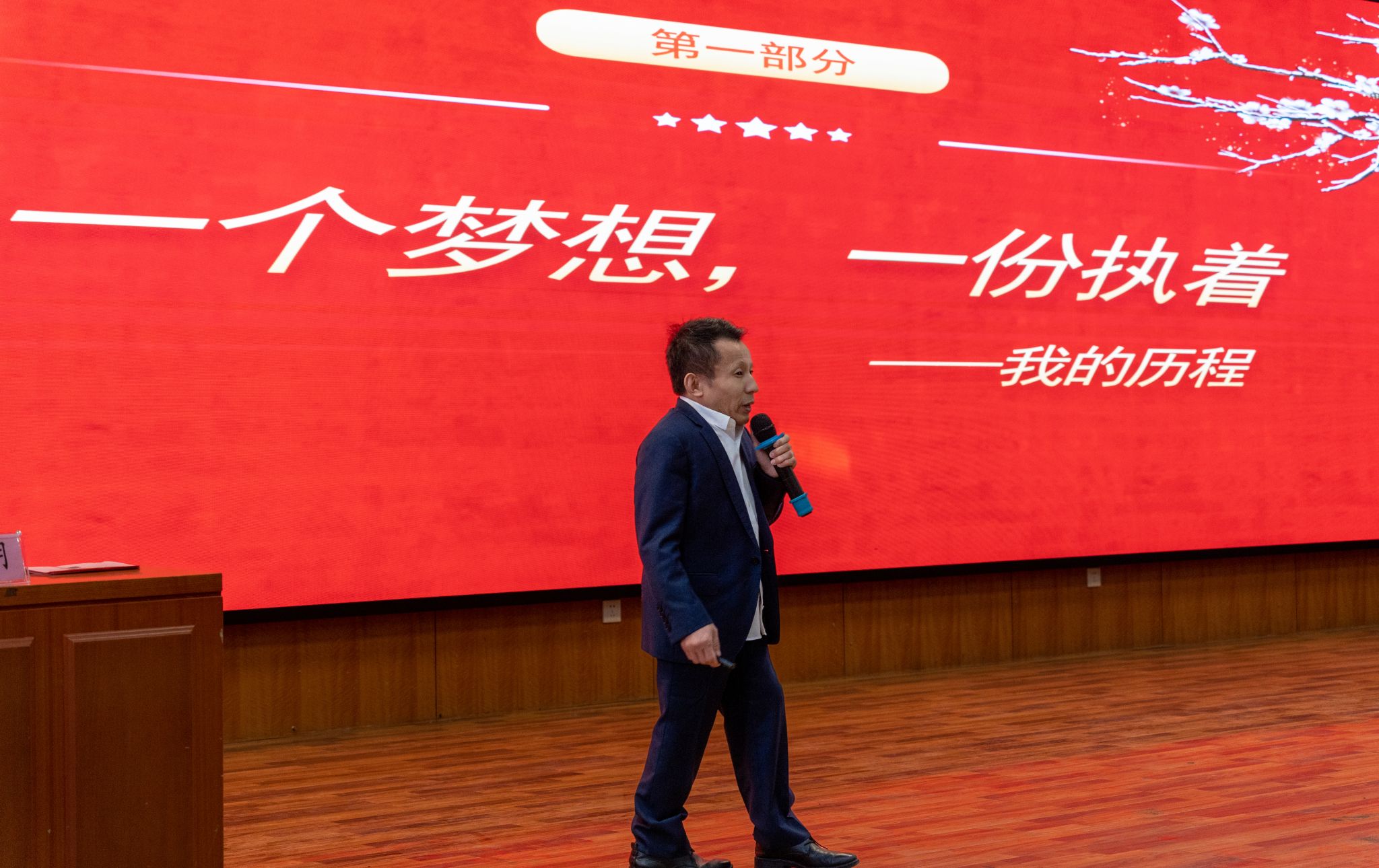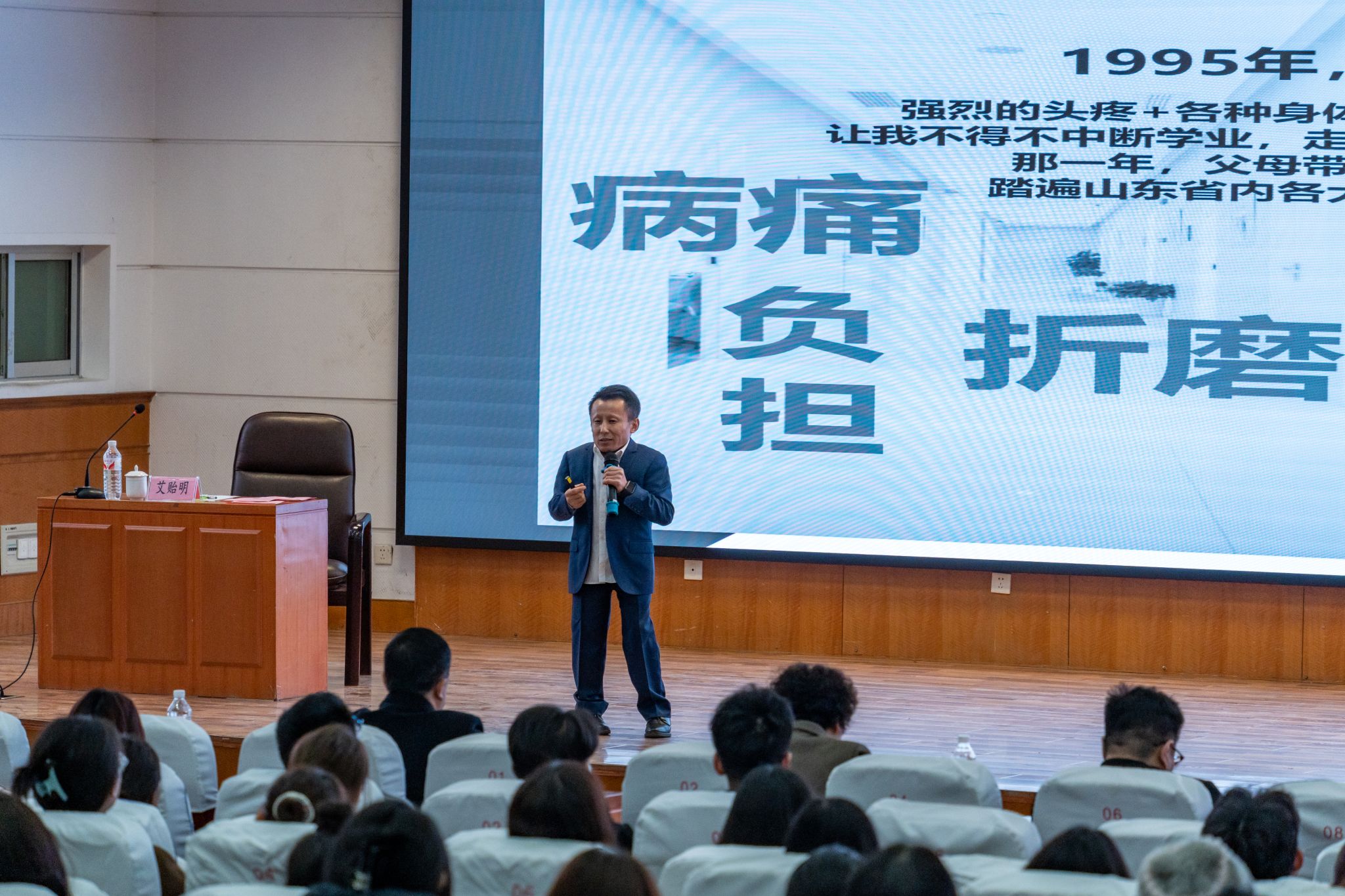 艾贻明以“不经一番寒彻骨,怎得梅花扑鼻香”为题,从坎坷人生路、创业奋斗历程、感恩回馈社会三部分分享了自己的奋斗历程和心得体会。1978年艾贻明出生在山东德州宁津县普通的农民家庭;3岁前没离开过医院;8岁后从没长过个;10岁,被诊断为“先天侏儒症”,身高定格在1米25;14岁,住院一年;17岁,因病痛不得不中断学业;18岁,只身到济南学一门技术;19岁,创业成立培训学校,党和政府的关怀坚定了自己奋斗的信念;20岁,全身过敏性自癫,全身毛细血管破裂;22岁,创办企业发展为山东省行业前三;27岁,工作时被当成乞讨人,被施舍了一元硬笔,更加激发了不服输的冲劲;30岁,企业转型升级;34岁,全身疼痛,卧床三年;37岁,变卖企业,一切归零;38岁,二次创业,重新出发;41岁,企业年营业额超过2亿元;45岁,股骨头坏死,一条腿更换股骨头;下个周,艾贻明要接受另一条腿的股骨头更换手术;截至目前,艾贻明累计捐赠扶贫物资及款项2000余万元,直接帮扶3000余名残疾人士。一个个数字,一张张照片,无不让现场观众感动落泪;一次次涅槃,一笔笔捐款,无不让青年学生为之振奋。