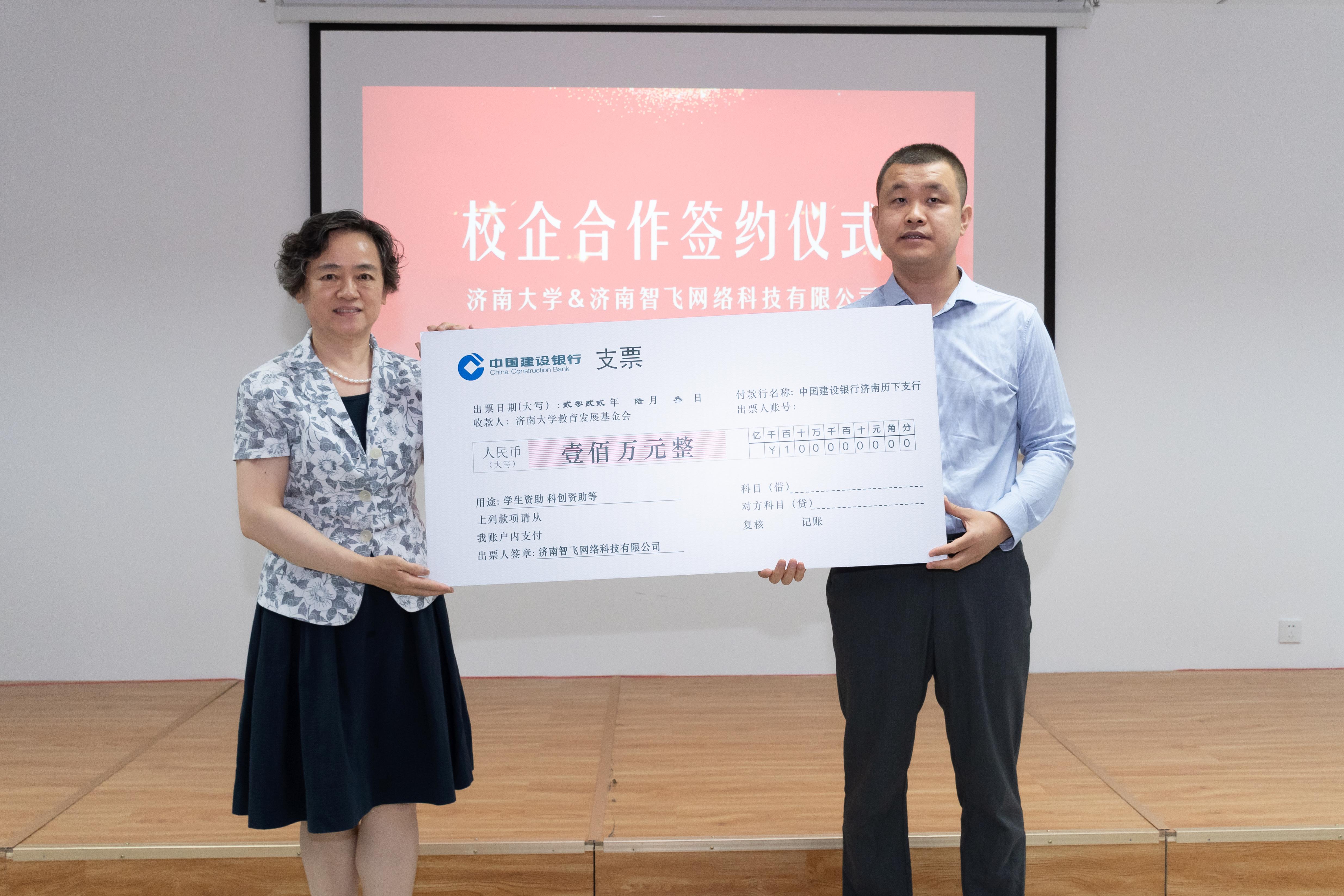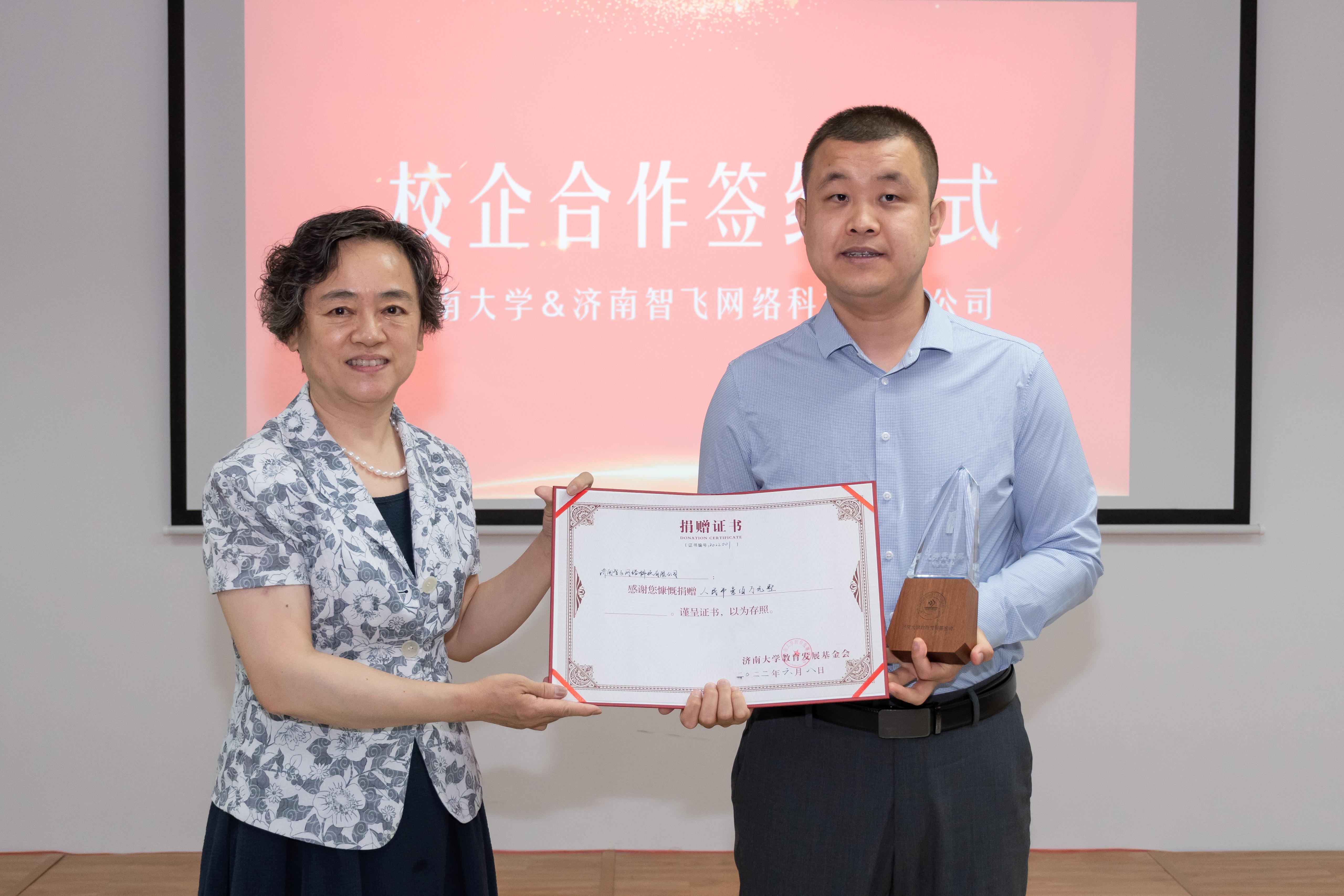 仪式上,智飞公司向济南大学教育发展基金会捐赠人民币100万元,定向用于开展学生资助、学生科技创新及优秀教师奖励等方面,助力济南大学教育事业发展。张硕秋副书记代表学校接受捐赠,并为尹滨校友颁发济南大学捐赠证书及奖杯。