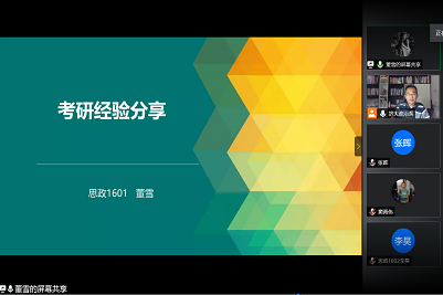 第二位为备考同学做考研交流的是于天雪同学。于天雪同学以优异成绩考上了山东师范大学的思想政治教育专业,她首先为大家推荐了她所使用的考研教材。在专业课的准备上,她建议同学们熟记热门话题,梳理框架、构建知识体系,在专业课题型设置上,于天雪同学建议同学们多读马克思主义原著。针对复试部分,她主要讲解了网络复试的注意事项,并针对复试内容给出了自己的建议。最后,于天雪同学结合自己备考的经验提出效率、兴趣、计划和心态上的一些经验。