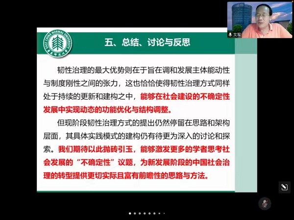 最后,高功敬教授进行了简要总结。他对文军教授带来的精彩讲座表达了诚挚的感谢,认为文军教授结合鲜活的生活体验,带来了一场内涵深刻、视野广阔、逻辑严谨的学术讲座,对于不确定性内涵演化的梳理、不确定性内容的精彩辨析非常值得我们师生认真学习,呼吁同学们在学术研究中要多读书、多思考,不断锤炼学术思维、提升研究能力。