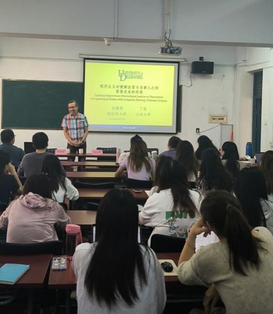 讲座伊始,孙教授对美国特拉华大学及相关院系进行了介绍,热情邀请同学们有机会赴特拉华大学学习深造。之后,孙教授以法官的职业风险为起点,借助统计学的知识,向同学们讲解以紧张关系为因变量、组织程序正义为自变量、外部信任和外部程序正义为中间变量的理论构架模型,通过数据分析阐明了法官对于当事人的信任程度受内部程序正义的影响,同时,组织程序正义对法官与当事人的紧张关系有直接的负面效果。在互动环节,孙懿贤教授和丁瑶博士后就同学们的提问进行了交流和解答。