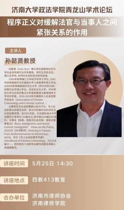 青龙山学术论坛在四教413举行。此次论坛邀请美国特拉华大学社会及刑事司法学系孙懿贤教授,作题为《程序正义对缓解法官与当事人之间紧张关系的作用》的报告。此次报告由棋牌游戏