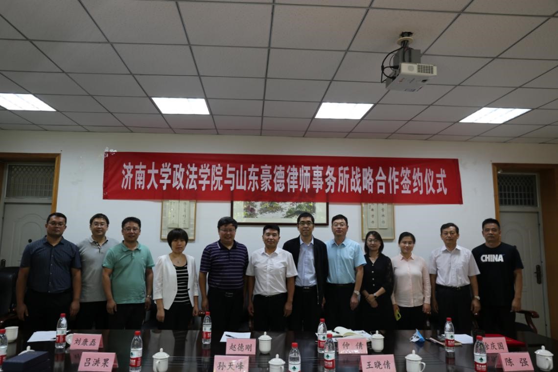 与山东豪德律师事务所校企合作共建专业战略合作协议》,徐庆国书记与吕洪果副主任共同为本科生实践基地揭牌,仲倩副院长与王晓倩主任共同为研究生实践基地揭牌,刘康磊副院长为受聘的豪德律所四位法律硕士校外合作导师颁发聘书。