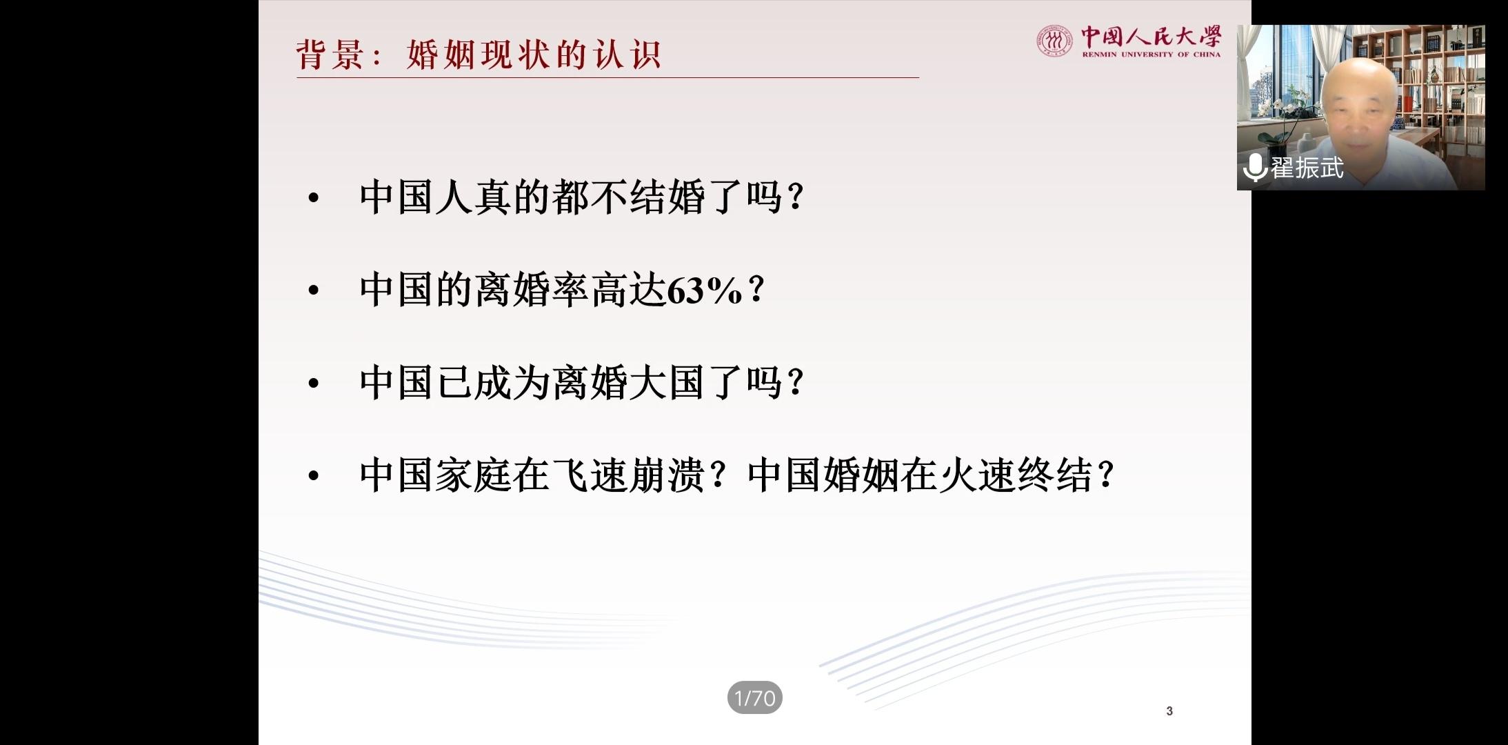 翟振武教授以婚姻现状的认识为背景,从“婚姻之变”和“婚姻之不变”两个方面详细阐述了中国婚姻的现状和未来。翟教授指出:在经济社会的迅速变迁中,受到市场经济发展、教育扩张、人口大规模流动、西方价值观念冲击等因素的影响,中国的婚姻发生了巨大的变化,但也维持着诸多独特之处,呈现出传统与现代相交织的特点。其中,翟教授从传统中国婚姻的特点和中国婚姻的现状与变化趋势两个角度来阐述传统与现代并存的中国婚姻状况,同时从初婚模式变化慢,初婚年龄不断提高,进入婚姻时间不断推迟等方面对此观点进行了翔实有力的分析与论述。最后,通过对婚姻和家庭的功能转变及教育的普及和扩张等方面的分析,翟教授对中国婚姻变化作出了进一步的细致讲解并在国际比较中看中国婚姻的未来,指出与发达国家相比中国已婚比例更高,结婚时间更早,婚前同居率相对较低等现实状况,普婚仍旧是中国人口婚姻状况的突出特点。