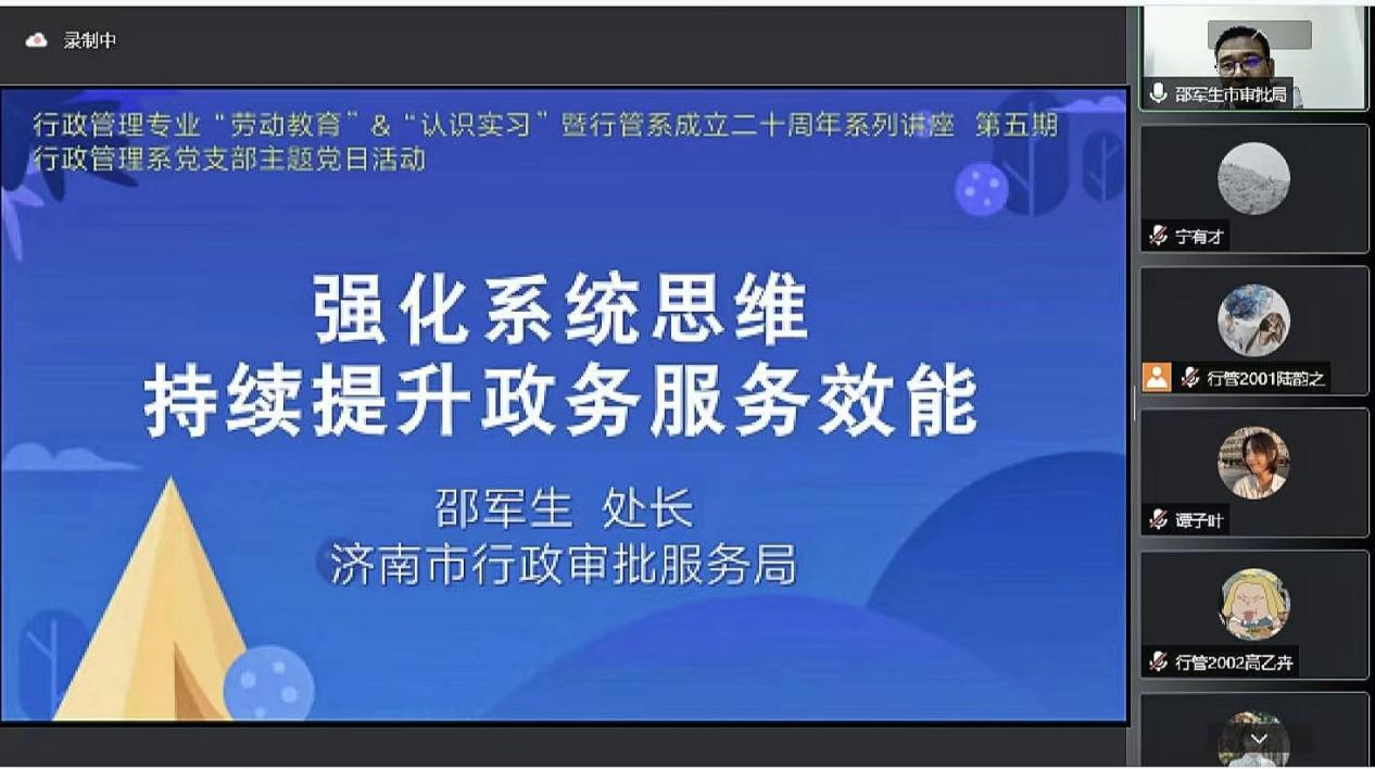 5月27日晚上,行政管理系“劳动教育”“认识实习”暨行管系成立二十周年、行管系党支部主题党日活动系列讲座第五期成功举行。本次讲座邀请到济南市行政审批服务局邵军生处长做《强化系统思维,持续提升政务服务效能》的主题报告。棋牌游戏