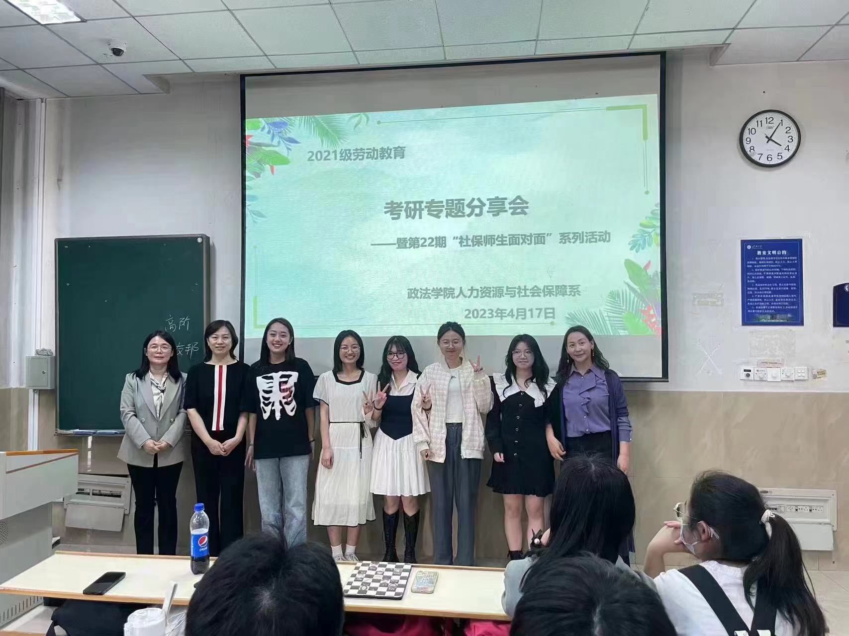 2021级劳动教育考研专题分享会暨人社系教工党支部第22期"社保师生面对面"系列活动于4月17日下午在第一教学楼顺利举行,此次活动由人社系教工党支部精心筹划,特邀2019级考研成功上岸的6名优秀毕业生进行经验分享,活动由任晓敏老师主持,刘艳丽老师、辛瑞萍老师参加,社保2021级及2020级全体同学共同参与。