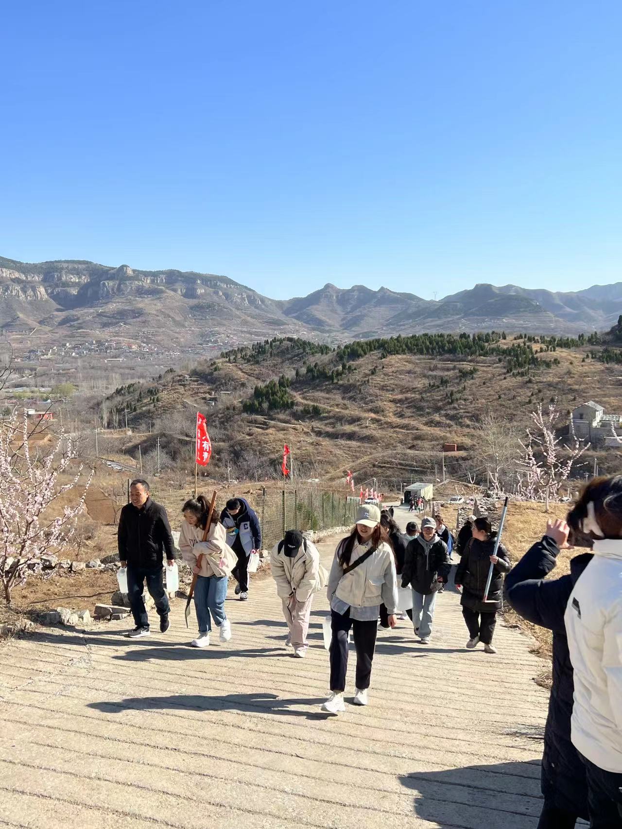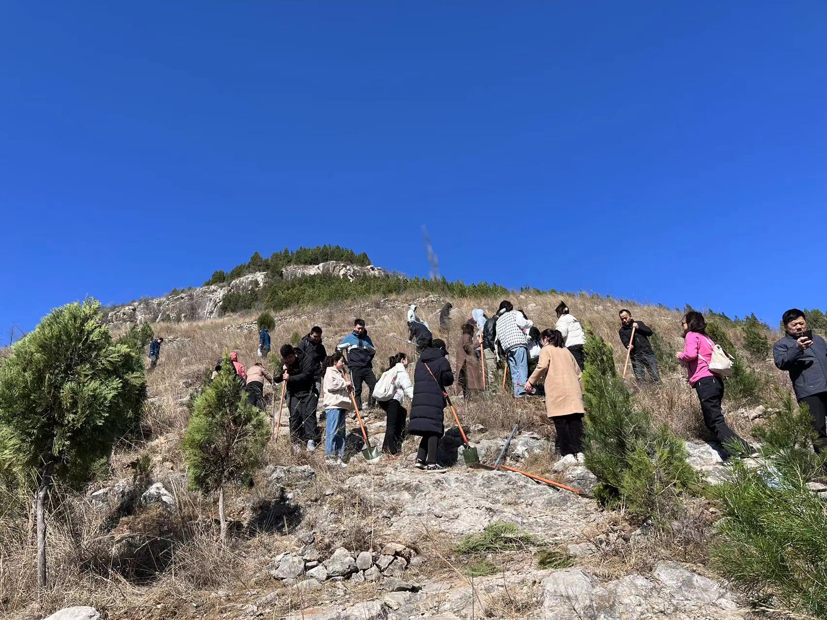 活动中,同学们和老师们干劲十足、热情洋溢,有的拿铁锹,有的拿水桶,有的拿树苗,整个现场到处都是忙碌的身影。大家分组合作刨坑,种树,埋坑,浇水,分工明确,各项环节有序进行,样样认真到位,经过两个小时认真奋斗,一颗颗小树苗挺立在山坡上,焕发出昂扬的生机。