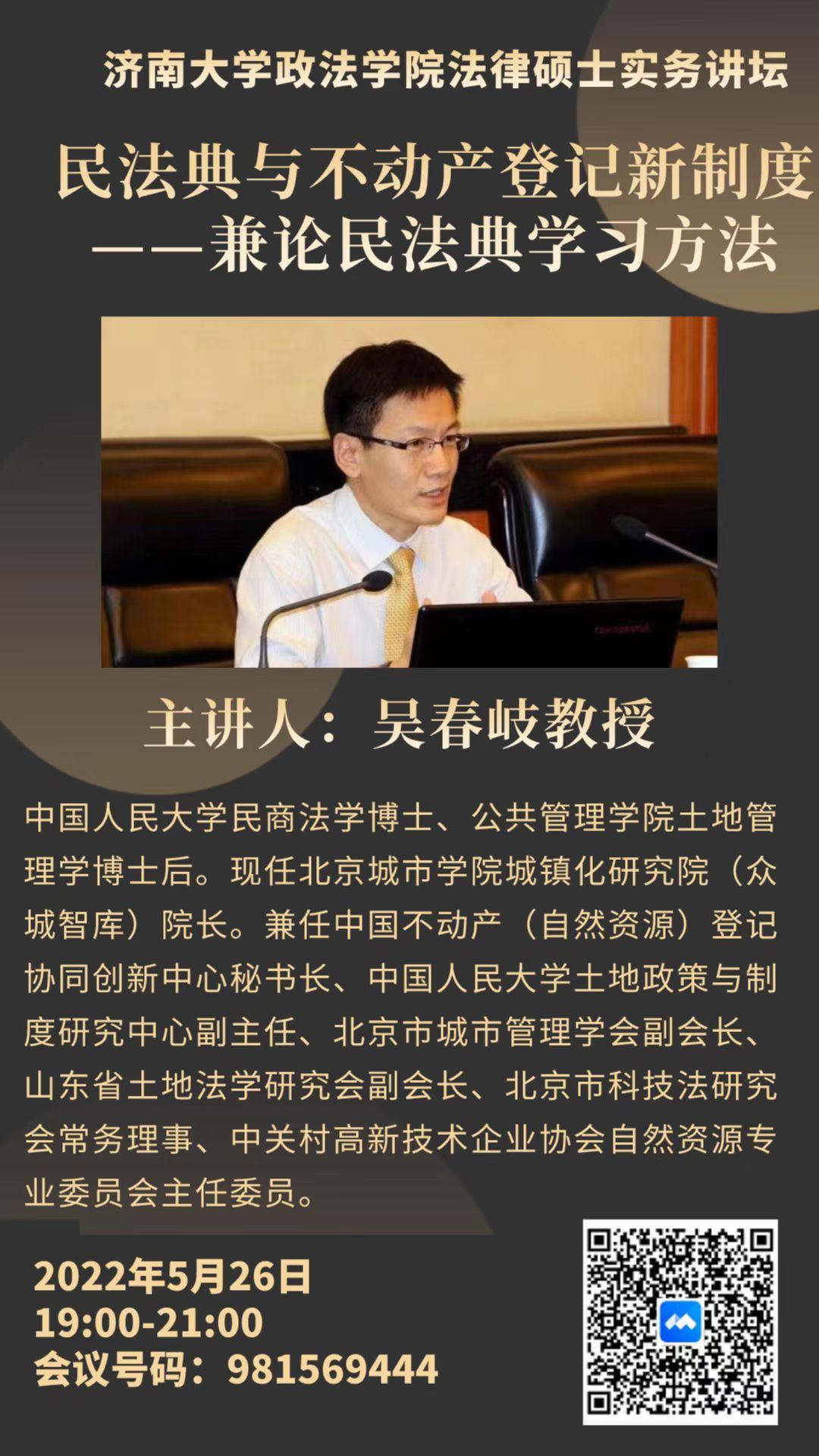 城镇化研究院(众城智库)院长吴春岐教授作题为《民法典与不动产登记新制度——兼论民法典学习方法》的学术报告。此次报告由法学系刘康磊副教授主持,棋牌游戏