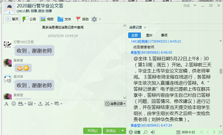 备案。答辩共分四组,每组3-4名答辩教师,指导教师实行回避原则。答辩小组组建QQ群,指定一名同学担任答辩小组组长,负责材料和信息分发收集工作,答辩小组秘书和同学们进行多次沟通,讲解网络答辩流程和注意事项,了解同学们网络答辩可能遇到的困难,并邀请部分同学进行网络模拟答辩,以确保万无一失。
