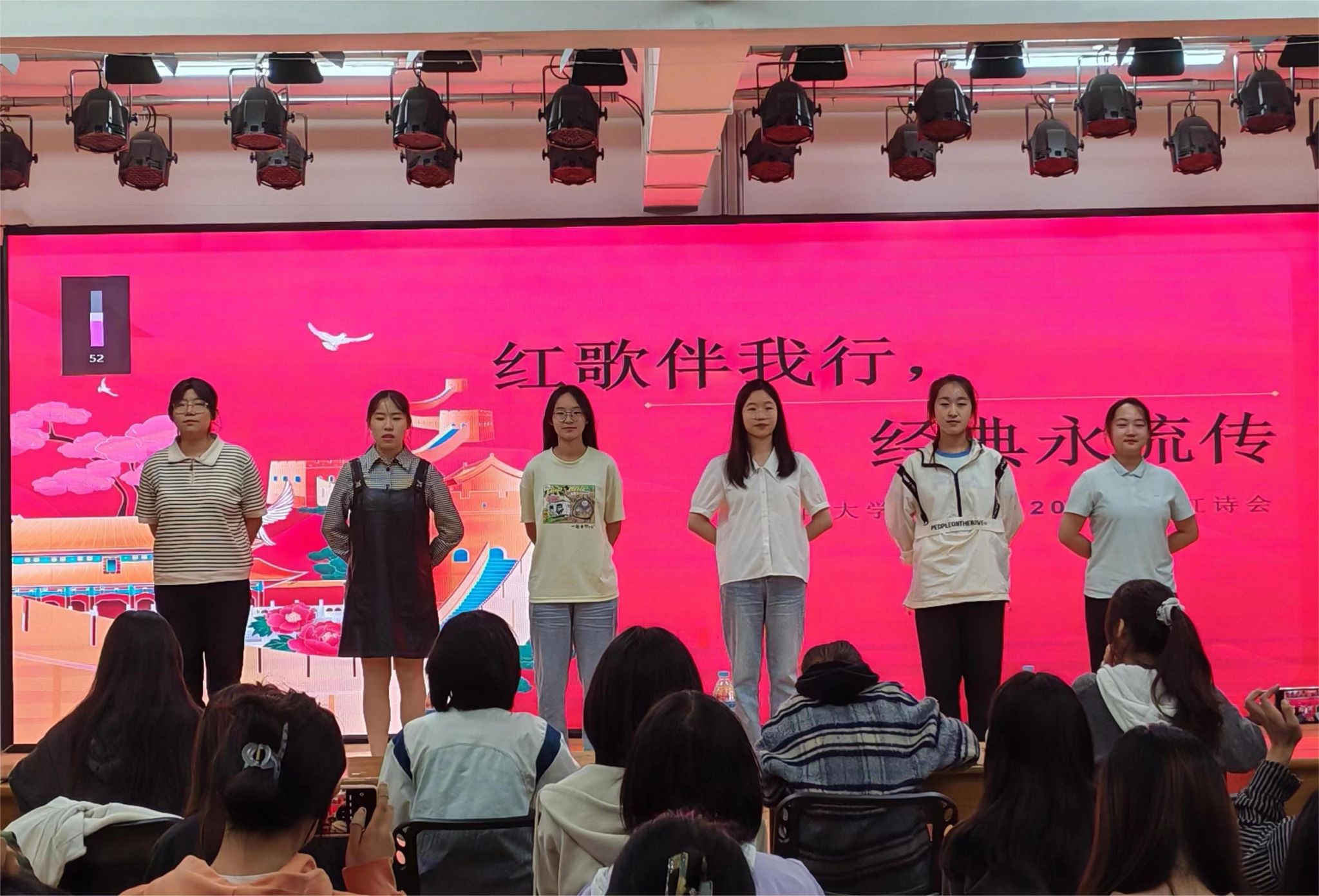 在大学生活动中心举办“红歌映初心,诗歌颂华章”红诗红歌会。红诗组选手诵声激昂,诉说爱国之情,红歌组选手歌声铿锵,唱响报国之志,参赛学生用红色经典重温中国共产党的光辉历程,以振奋人心的激昂旋律庆祝新中国成立75周年。活动展现了青年学生朝气蓬勃、健康向上的精神风貌,激励广大团员青年在实现中华民族伟大复兴中国梦的新征程上奋勇前进。