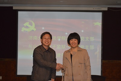 法学系的党建工作以及学科建设。双方交流后,共同签订了结对共建协议并且观看了山东省女子监狱宣传片。期间,女子监狱一监区党支部党员李佳佳同志向大家分享了疫情期间自己的援鄂经历,令人赞佩和敬仰。双方共同观看了济南大学宣传片,进行了互相讨论座谈交流。结束了签约座谈后,最后双方进行了合影留念。