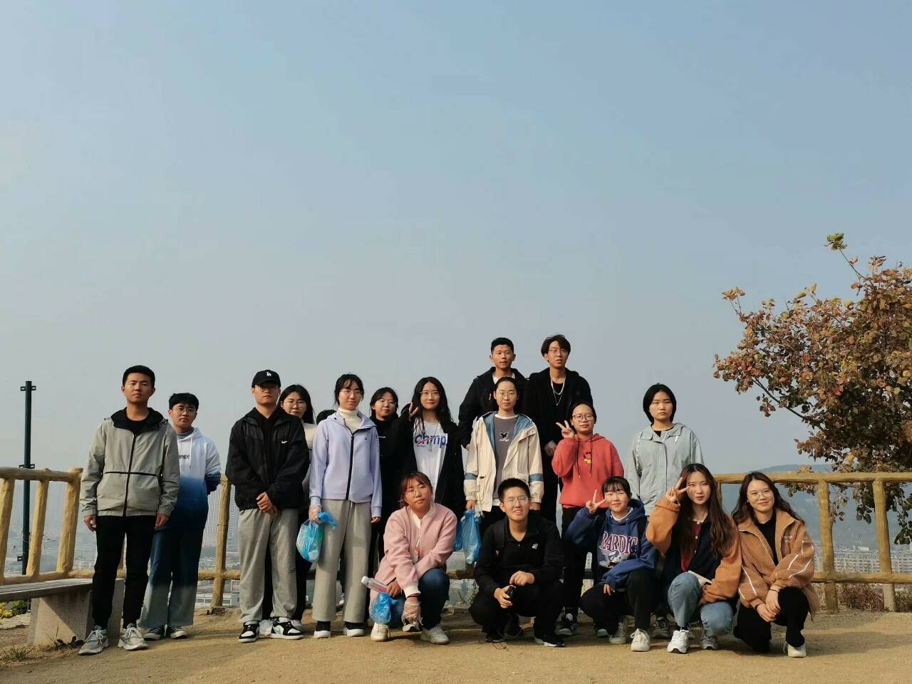 一路上秋风微凉,但志愿者们热情不减。到达第一处休息地点后,李红波向大家讲解了垃圾分类的相关知识,以呼吁同学们在日常生活中将垃圾分类,让资源再生。短暂休整过后,志愿者们继续前进。树影幢幢,山高路陡,在保证自身安全的前提下,志愿者们也在积极捡拾沿途的垃圾,保护青山绿水。不久,志愿者们便到达了第二处休息地点,张云涛开始向大家讲解消防知识,让志愿者们认识到了消防安全的重要性。随后,志愿者们继续向上攀登,终于抵达半山腰处的凉亭。孙晓蕾为大家讲述了中国传统建筑——“亭”的有关知识,丰富了大家的传统知识储备。在这里,志愿者们一起玩了许多小游戏,活跃了活动氛围,拉近了同学们之间的距离。旅程还未结束,志愿之旅还在继续。登高望远,秋意更浓,山顶的风景令大家耳目一新。志愿者们纷纷拍照留念,记录下这个美好瞬间。欣赏完风景并捡拾完山顶的垃圾后,志愿者们开始有序下山。返回的过程中,同学们仍不忘留意是否还有垃圾遗留。途中,田茂泉还为大家讲解了气候与植被的有关知识,加深了大家对大自然的了解。 下午4:00,全体成员安全返回山脚。志愿者们做最终清点时发现捡到的垃圾并不算多,这一点让大家非常高兴,欣慰于环保理念深入人心,本次活动也画上了圆满句点。