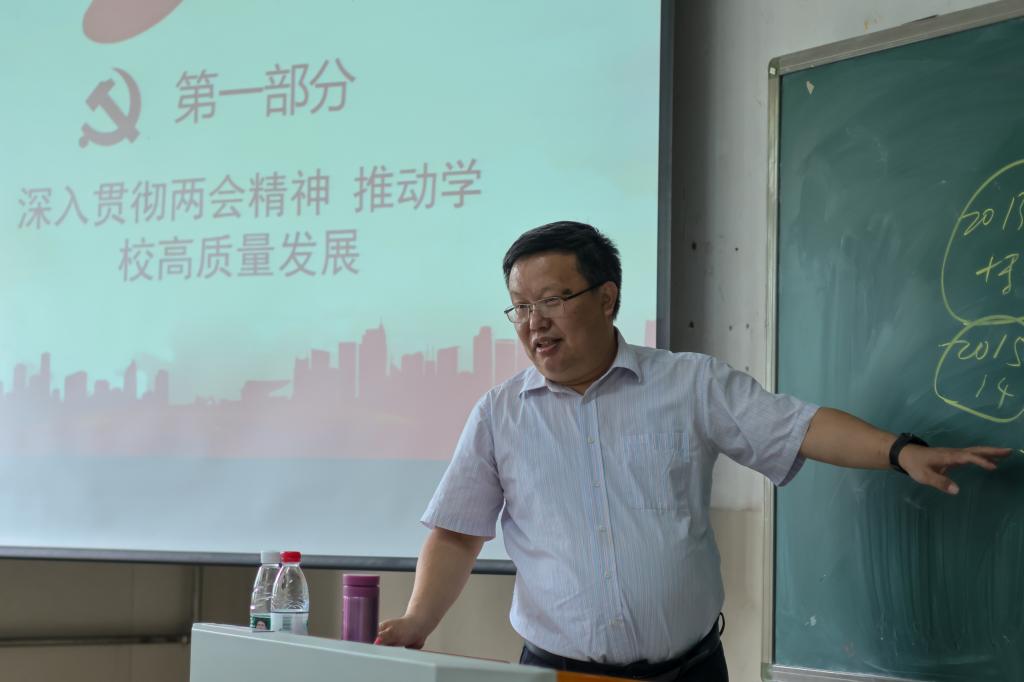 徐部长从深入贯彻两会精神、推动学校高质量发展;开展主题教育,坚持学思用贯通、知信行统一;增强安全意识、创建平安校园;加强党风廉政建设、深入推进全面从严治党四个方面展开讲解,立足国情、社情、校情,结合学生专业特色,用生动的语言、鲜活的案例、深刻的道理,引导同学们深刻领悟“两个确立”的决定性意义,增强“四个意识”、坚定“四个自信”、做到“两个维护”,深入学习宣传贯彻全国两会精神和党的二十大精神,贯彻落实学校第四次党代会确定的目标任务,推进学习贯彻习近平新时代中国特色社会主义思想主题教育走深走实。课堂上,师生互动交流深入、课堂气氛热烈融洽,最后十分钟,徐部长与同学们围坐在一起,同学们围绕学校发展、棋牌游戏