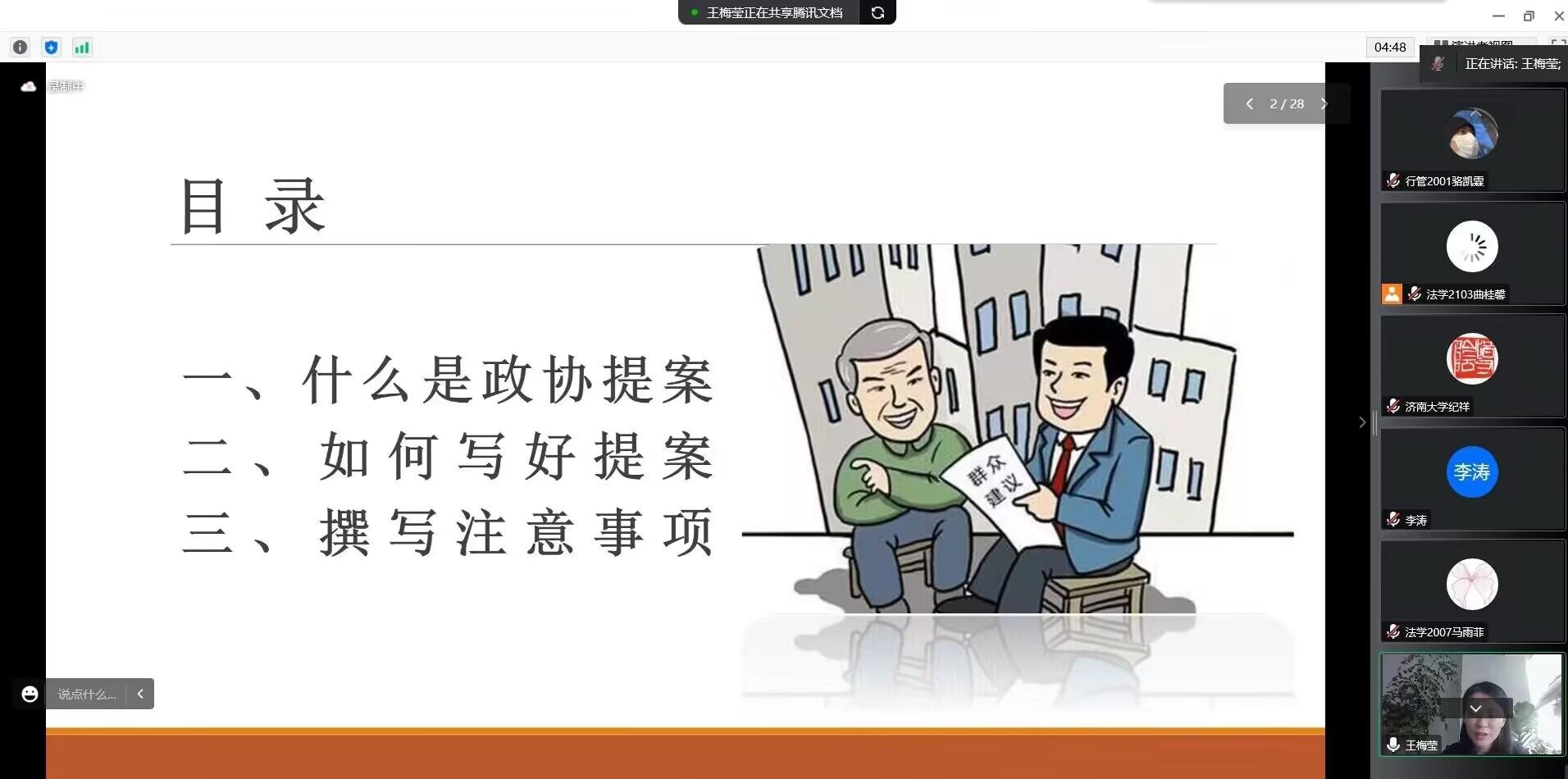 培训邀请了民建济南市委会议政调研处三级调研员王梅莹,王处长从什么是政协提案、如何写好政协提案、撰写注意事项三个方面为大家介绍了政协提案的类型和发展历史,结合被全国政协和山东省政协采用或批示的提案文本详细讲解该如何确定模拟提案主题,有效开展社会调查,规范撰写模拟提案等。王梅莹处长对与会同学提出的问题逐一解答,互动热烈,氛围良好。