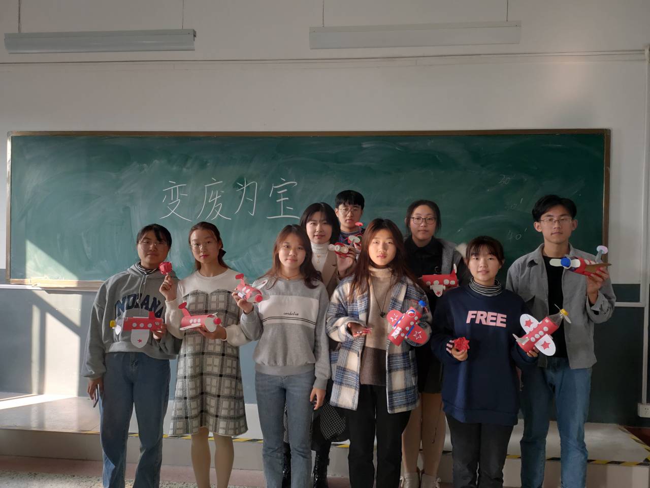 阳光先锋青协将“垃圾分类”活动收集到的一批可回收垃圾作为此次活动的原始材料。早上8:00,志愿者们到达济南大学4教504教室,坐在桌子前对着教学视频,利用收集来的塑料瓶和废纸认真的做着手工。志愿者们用剪刀小心地将废纸裁剪成许多不同的形状,又将它们粘在瓶子上,使原本被丢弃的塑料瓶变成了一架架即将起飞的飞机。在变废为宝过程中,为充分利用资源,志愿者们还将一些废纸折成了莲花灯、玫瑰花和蝴蝶。在活动中,志愿者们不仅学习到了手工小知识,还对环保有了进一步的认知。活动结束时,每个志愿者桌前都有着许多手工作品,他们将作品放于事先准备好的纸盒中,便于后续义卖活动。至此,本次变废为宝活动圆满结束。