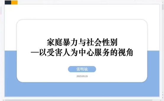 致辞,诚挚欢迎张明敏副主任的到来。随后,张明敏副主任结合丰富的反家暴案例娓娓道来,从社会性别理论和反家暴法理有机融合的视角,生动详实地阐述了家庭暴力的界定和根源、家暴受害人的困境、反家庭暴力的工作机制以及以受害人为中心的服务等内容,深入剖析了反家暴立法与实践领域推进性别平等的重要意义、动力机制和可行实践路径。讲座中,张明敏副主任着重强调了专业社会工作在深入推动反家暴法律法规落实过程中的重要作用,指出社会工作者应秉持专业价值理念,发挥专业优势,切实关注多重困境中的家暴受害人,开展以受害人为中心的服务,并鼓励同学们在反家暴领域进行跨学科研究与实践。在现场互动环节,张明敏副主任认真回应了同学们提出的反家暴法律宣传、遭受家暴女性与男性权益保障等诸多问题。