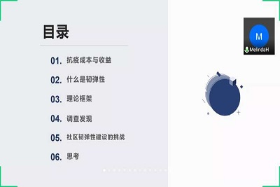 在讲座中,韩芳老师首先描述了我国在新冠疫情中的抗疫成本与收益,从经济成本与非经济成本、可见成本与不可见成本两个角度深刻反映出我国在此次疫情中的投入成本之大,也从制度优势凸显、方法有效性、政社关系新认知三个方面论述了我国在此次疫情中所获得的收益。然后,韩芳老师从韧弹性的概念出发,将韧弹性与社区治理相结合,介绍了涵盖社区基础设施、公共服务、社区结构、社会资本、社区文化等要素的社区韧弹性建设。接着,韩芳老师基于自己在2月份开展的关于COVID-19疫情的韧弹性感知调查问卷,展示了四个方面研究发现:地方依恋提升、社会资本整合缺位、基层风险沟通难以跨越“知识鸿沟”以及基层治理获得较高认可。韩芳老师还指出社区韧弹性建设的挑战,包括看不见的手、治理新问题、来自基层公共卫生的挑战三个方面。最后,韩芳老师进一步对社区治理韧弹性建设之路进行思考,认为可以从制度保障、技术支持、资源下沉、网络建构四个方面对社区机构进行韧弹性建设,并提出后疫情时期的社区治理可能会伴生的问题,比如群防群治的持续性、行政力量挤压市场力量或社会力量、谁来建构社区抗疫故事、社区记忆力衰退导致的韧弹性遗忘等问题。