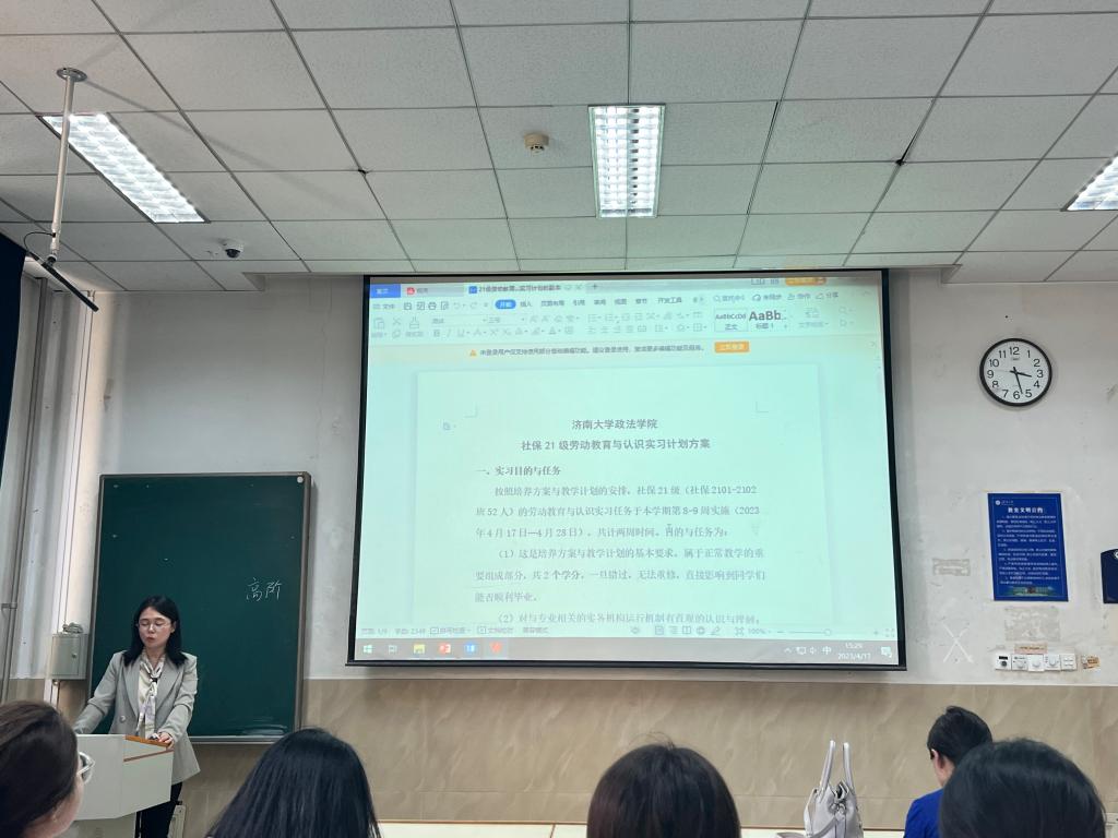 会议伊始,刘艳丽老师以习近平总书记的“幸福是奋斗出来的”拉开序幕,分别就实习目的与任务、实习报告与实习日志要求和实习考核与成绩构成这三个主要内容向大家详细的讲解。实习内容依据劳动与社会保障专业特点,围绕考研就业、社会实践、咨询宣传、专业讲座等开展,增强学生劳动意识,培养学生的专业意识、专业认同和社会责任感;同时,为大家介绍了本次实习需要用到的“校友邦”实习实训平台。最后刘艳丽老师强调在实习和参观期间要注意自身安全和纪律问题,体现出济南大学学子的基本素养和应有风采。