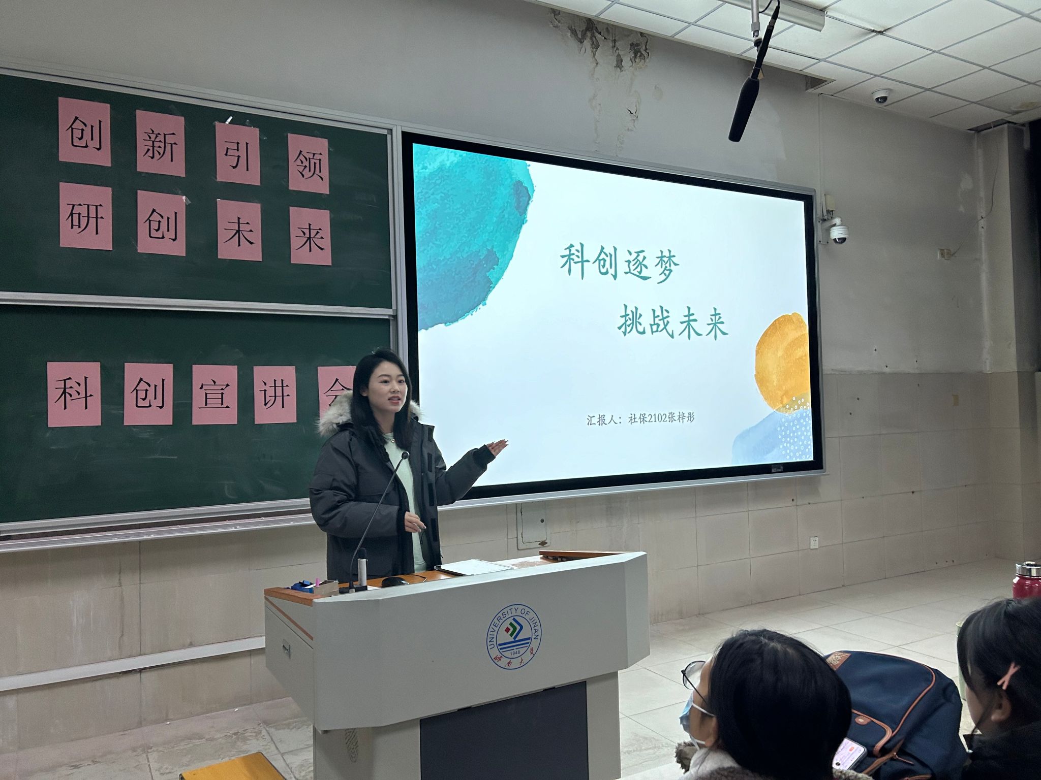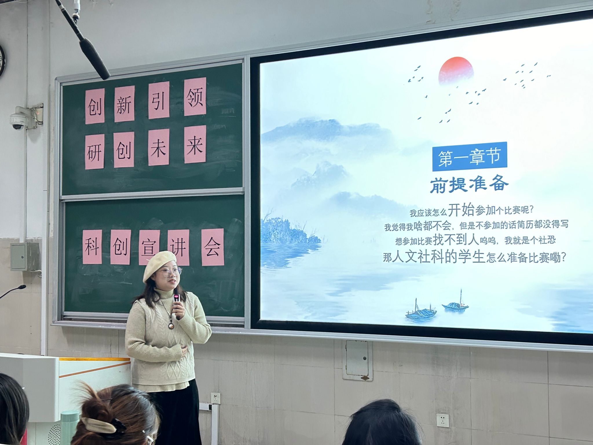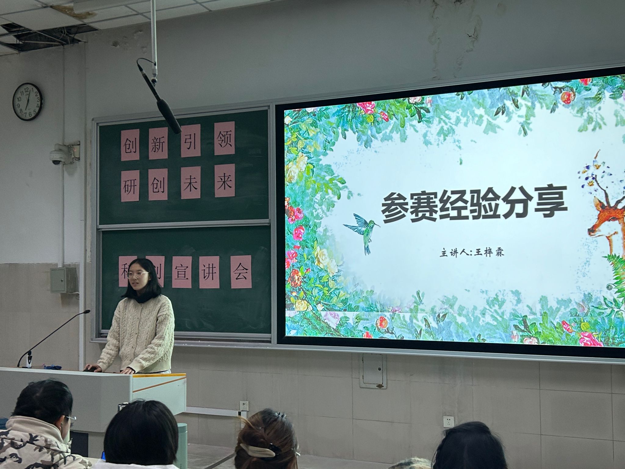 于2023年11月29日在2教302教室举办第二期“创新引领,研创未来”科创宣讲会。此次宣讲会由第十八届“挑战杯”全国大学生课外学术科技作品竞赛国赛一等奖获奖团队中的林晓晶、张梓彤和王梓霖担任主讲人。