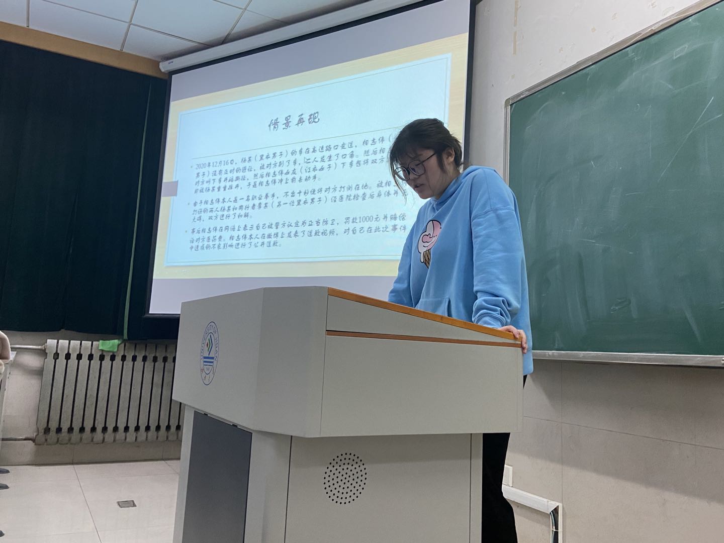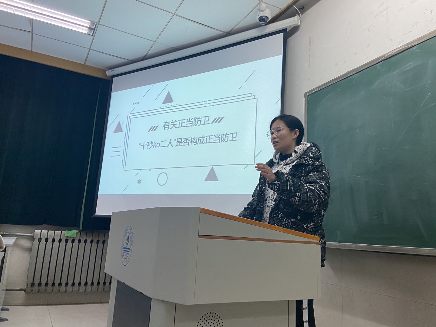 第一位上台的王文静同学,向大家推荐了E·博登海默的《法理学——法哲学及其方法》一书。她按照本书的内在逻辑结构,从历史概论、法律的本质和作用以及法律的渊源和技术三个角度详细剖析,让同学们在复习了法理学知识的同时更加全面地了解本书。第二位分享法治知识的刘柏君同学,对“十秒ko两人是否构成正当防卫”这一热点问题进行了详细的案例分析。她将本次事件分为两个阶段,并对两个阶段行为的主客观原因以及防卫限度等条件进行了详细的阐述,并抛出前一阶段属于正当防卫而后一阶段属于防卫不适时的观点,同时以于欢故意伤害案、昆山反杀案做为本案例的对比,为同学们提供了一个新颖独特的案例分析角度。第三位分享法治知识的许莹莹同学,也就此案例进行了剖析,并抛出了另一种观点。她将正当防卫的构成要件逐一列举,认为相某的行为未满足其中某些要件,所以其ko行为不构成正当防卫。许莹莹同学以幽默的讲述方式,不仅带同学们复习了上学期的刑法知识,也为大家提供了又一观察角度。第四位张璇同学认为此案例中相某的行为构成正当防卫。她适当地融情于法,将正当防卫以及防卫过当行为进行了详细解释,阐明了自己的观点。