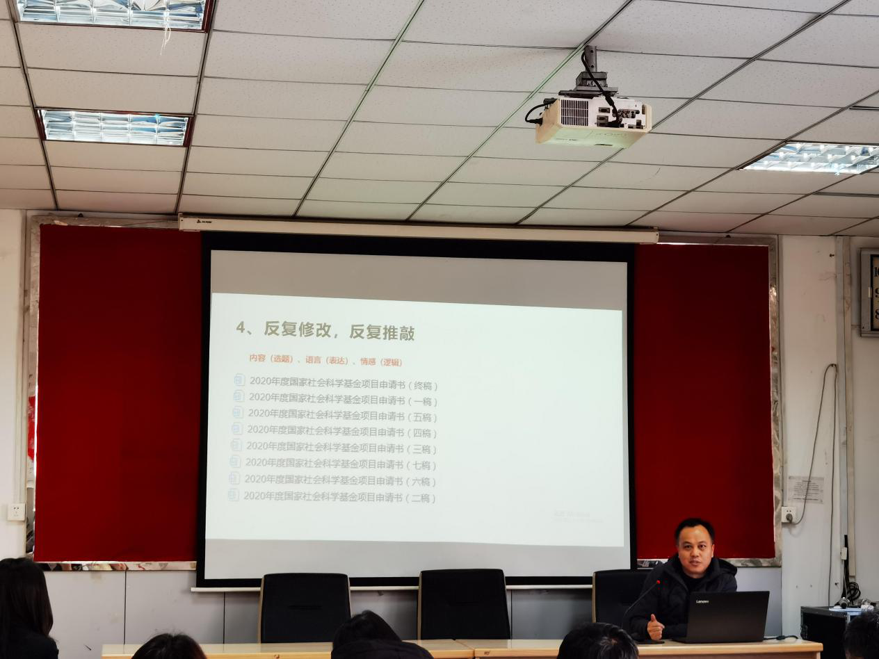 任慧颖副处长向大家介绍了我校国家社科基金申请的基本情况以及国家社科基金的评审流程,并希望大家能够继续努力,争取在2021年取得更好的成绩。