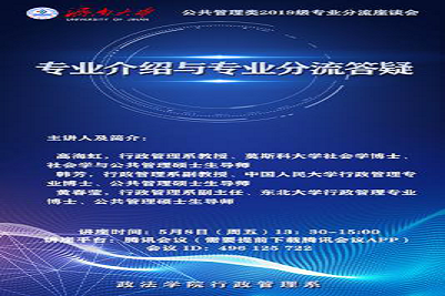 高海虹老师从行政管理专业与公职人员考取的区别与联系以及专业学习的建议两方面展开讲解,着重谈了“类公务员思维”。她指出,具有“类公务员思维”的人看到社会问题后会考虑想到目前治标的解决方案,以及长期如何解决即如何治本的问题,会自动站在国家角度,以一种经过培养的常态思维去观察社会问题并自发有意识地去解决。这种“类公务员思维”对人生成长和职场发展规划非常有帮助,这也正是行政管理专业人才的培养目标。最后,提出三点学习建议:首先要拓展认知范围,提升阅读理解能力;其次要锻炼综合分析能力,珍惜实践机会;第三要熟知各类考试的内容与要求,加强知识积累。韩芳老师从专业发展进程、社会需求、专业未来发展以及就业四个方面展开。韩老师回顾了行政管理专业发展,认为行政管理专业比较年轻、前景比较好;结合自身学习经历以及对今年新冠疫情,认为行管人才的社会需求大、缺口大;行政管理人才是具有服务能力,服务意识、具有公共精神和团队意识的,就业面广;最后希望学生要有所兴趣,坚守本心,做出理智选择。黄春莹老师从行政管理专业本身、培养体系、课程设置、留学考研等方面展开。黄老师提出大行政的概念,指出行管专业就业面广;学科知识基础交叉,人才培养的知识面宽,综合素质能力强,适应性强等。最后提出三点要求:做一个自律的人;对于专业分流结合自身兴趣和未来发展走向进行合理的选择;无论走到哪一个学科领域都不要挂科。互动答疑环节结束后,宁有才希望同学们能从老师们的介绍和答疑中进一步认识自己,认识专业,了解专业,欢迎志同道合者加入行管大家庭,祝愿各位同学都能选到符合自己兴趣、发挥自己优势、职业前景光明的专业。