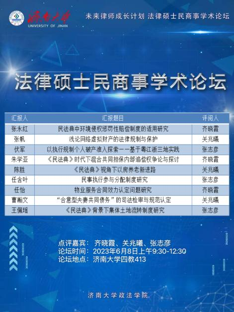 2023年6月8日上午,2023年第二期法律硕士民商事学术论坛在济南大学主校区4J-413举办。本期论坛邀请法学系齐晓霞、张志彦和关兆曦三位老师担任评委。张永红、张帆、伏军、朱学亚、陈胜、任含叶、任怡、曹瀚文、王佩瑶共9位法律硕士研究生分别就各自论文的选题、写作思路、论文结构、创新点进行了阐述。三位评委从论文题目、论文结构、论文的注释及参考文献等方面进行了精准的写作规范指导,同时对论文涉及的学术前沿问题、研究方向和研究深度进行了深入阐释。论坛的最后,经评委老师打分确定了本次论坛的获奖同学名单。