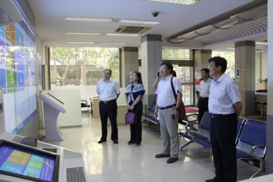 徐庆国书记、梁丽霞院长一行首先参观了仲裁院网上办案、自助终端服务系统以及仲裁庭等基础设施建设情况,对仲裁院信息化建设、仲裁庭建设给予高度评价。