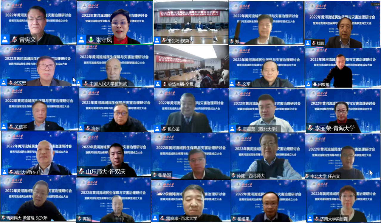 )、济南大学社科处、济南大学发展规划与学科建设处承办的“2022年黄河流域民生保障与灾害治理研讨会暨黄河流域民生保障与社会治理协同创新联盟成立大会”采用线上线下相结合的方式成功举办。来自中国社会学会、中国社会保障学会、中国人口学会、中国行政管理学会、中国人民大学、南开大学、南京大学等50多所高校、科研院所、学术组织的领导、专家学者、研究生和山东省教育厅、山东黄河河务局等政府机构的领导嘉宾共350多人参加了本次大会。山东省教育厅科学技术处处长曾宪文、济南大学党委书记刘春华、西北大学副校长吴振磊分别致辞,济南大学校长刘宗明宣布“黄河流域民生保障与社会治理协同创新联盟”成立事宜,济南大学社科处处长张守凤主持大会开幕式。