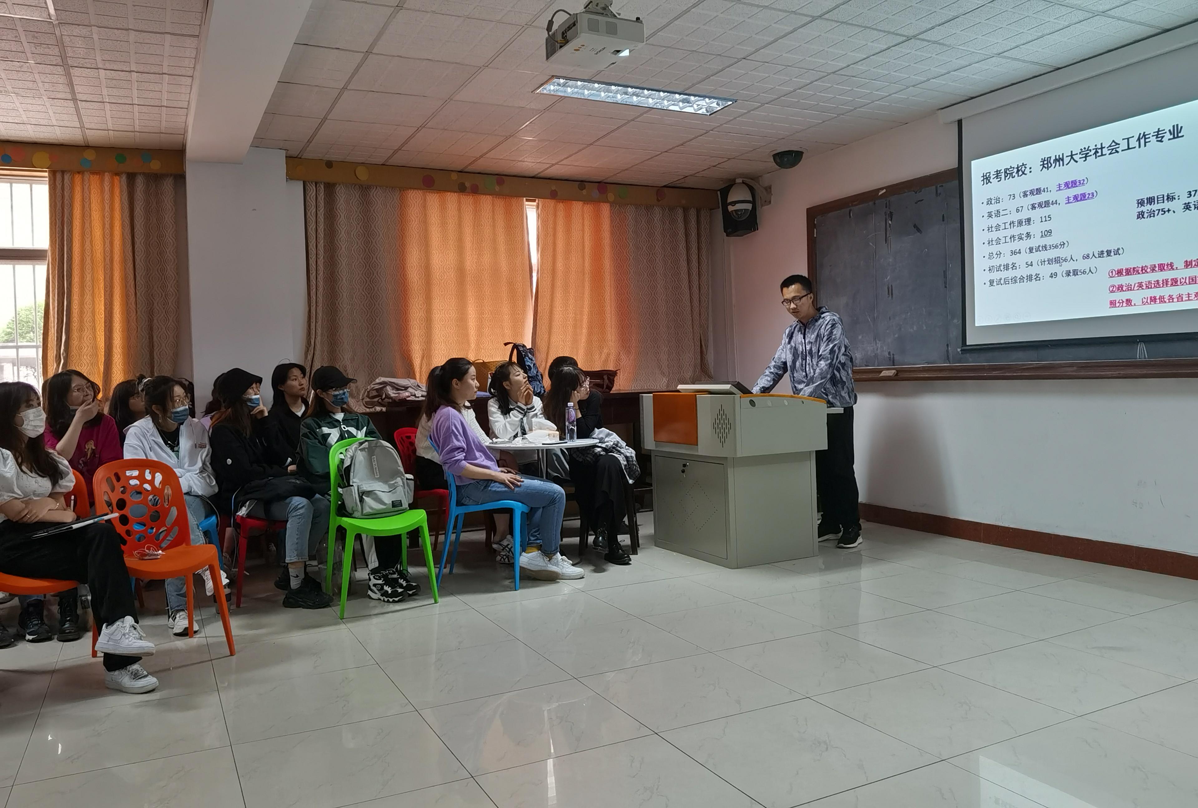 分享会上,邱莉老师首先介绍了我系社会工作2017级校友的考研情况。2017级的赵本鑫、龙金山、朱笑炎、吴力维、商兴钰、任佳等六位同学已分别被南京大学、郑州大学、济南大学等录取,他们分别从专业思维训练、专业课复习和答题技巧、英语和政治公共课的备考经验、复试面试注意事项等方面,分享了自己的考研经验和心路历程,并进行了现场提问解答,为参加活动的2018级同学鼓劲加油。最后,邱莉老师进行了总结,勉励和期待同学们在考研道路上不断提高竞争力,成功上岸。本次考研经验分享和成功榜样坚定了2018级同学的考研信心。