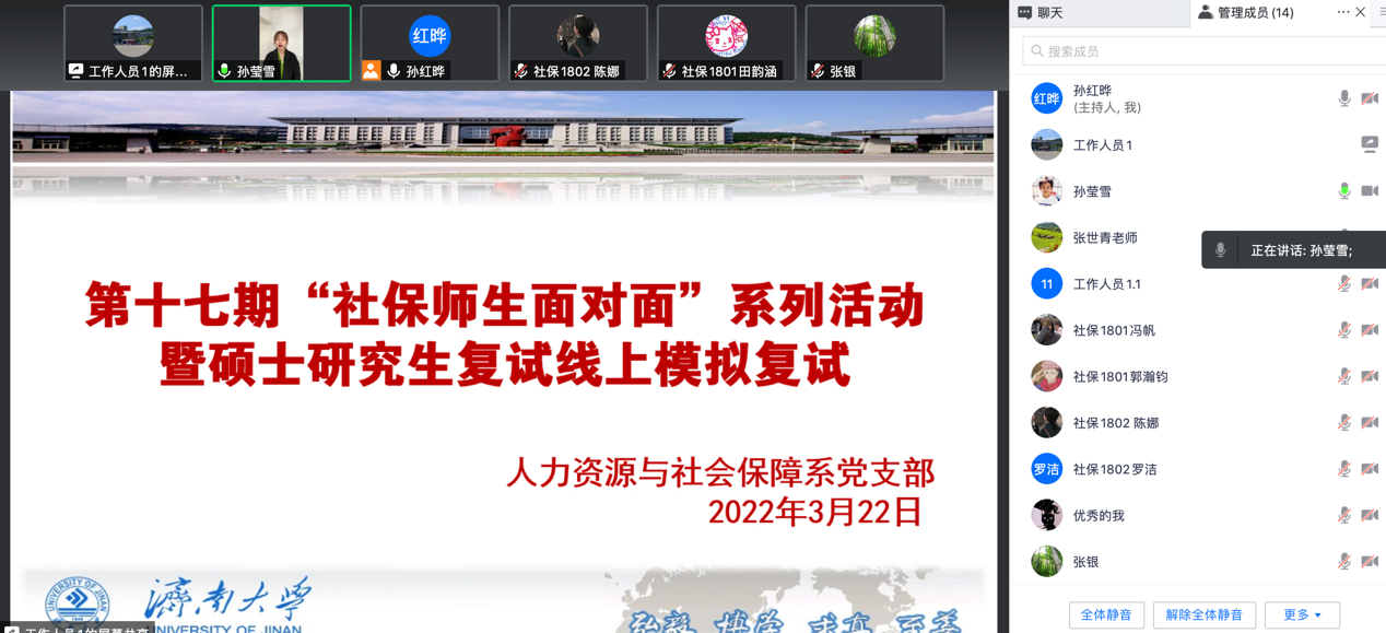 2022年3月24日下午,人力资源与社会保障系第十七期“社保师生面对面”系列活动暨硕士研究生模拟复试通过腾讯会议的形式在线上举行。人力资源与社会保障系教师孙红晔、张世青、张银,社会学系教师韩钰以及2018级进入复试的部分同学参加了此次活动,活动由孙红晔老师主持。