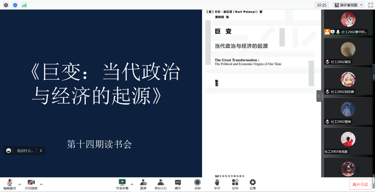 团委共同举办的第25期卓越阅读书香活动顺利举行,此次活动由董宇同学主持,社工2002班刘佳蓉、付杰、崔佳、徐祎凡、刘新雨、张文慧、韩晓菲、李旭晨、袁财锋、黄立勋、潘坤等12名同学采取腾讯会议线上交流方式,共读《巨变:当代政治与经济的起源》一书。