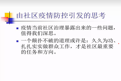讲座中,乔世东教授根据最新的调研成果和丰富的研究经历,介绍了疫情期间社区的主要职能和任务、疫情期间各个社区的居民动员能力、对未来基层社区治理的政策建议三个方面的内容,并且结合自身对社区疫情防控的思考与同学们展开了热烈的讨论。在疫情期间的社区居民动员能力方面,乔世东教授结合典型社区案例,讲述了该社区“五队”、“四控”的有效防疫动员措施,引发大家的积极探讨。然后,乔教授从社区应回归其基层群众自治属性,充分发挥其群众性、自治性特点;政府应加大社区公共投入,培养社区居民的社区归属感和认同感;改变防疫期间社区接受多元、多部门领导,变为一个部门统一领导三个方面谈到了对未来基层社区治理的政策建议。最后,乔老师提出只有久久为功、扎扎实实做群众工作,才是社区最重要的任务和方向的正确路径,也只有这样,社区和居民的关系才能回归为“鱼水”的关系,真正打通“最后一公里”。