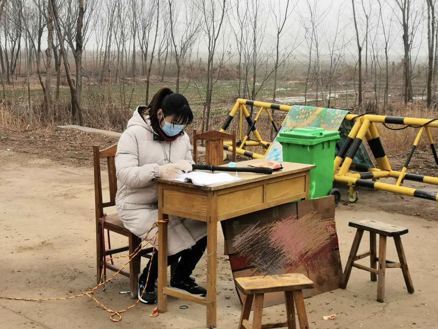 8.社会工作1801班的王莹,家住济南市市中区青桐山村,并于2月1日自愿报名成为疫情防卫工作站的一名志愿工作人员,每天的12:00-15:00是工作时间,穿上马甲,戴上口罩,在村口疫情防卫工作点值班,为来往的车辆与人员做好登记。