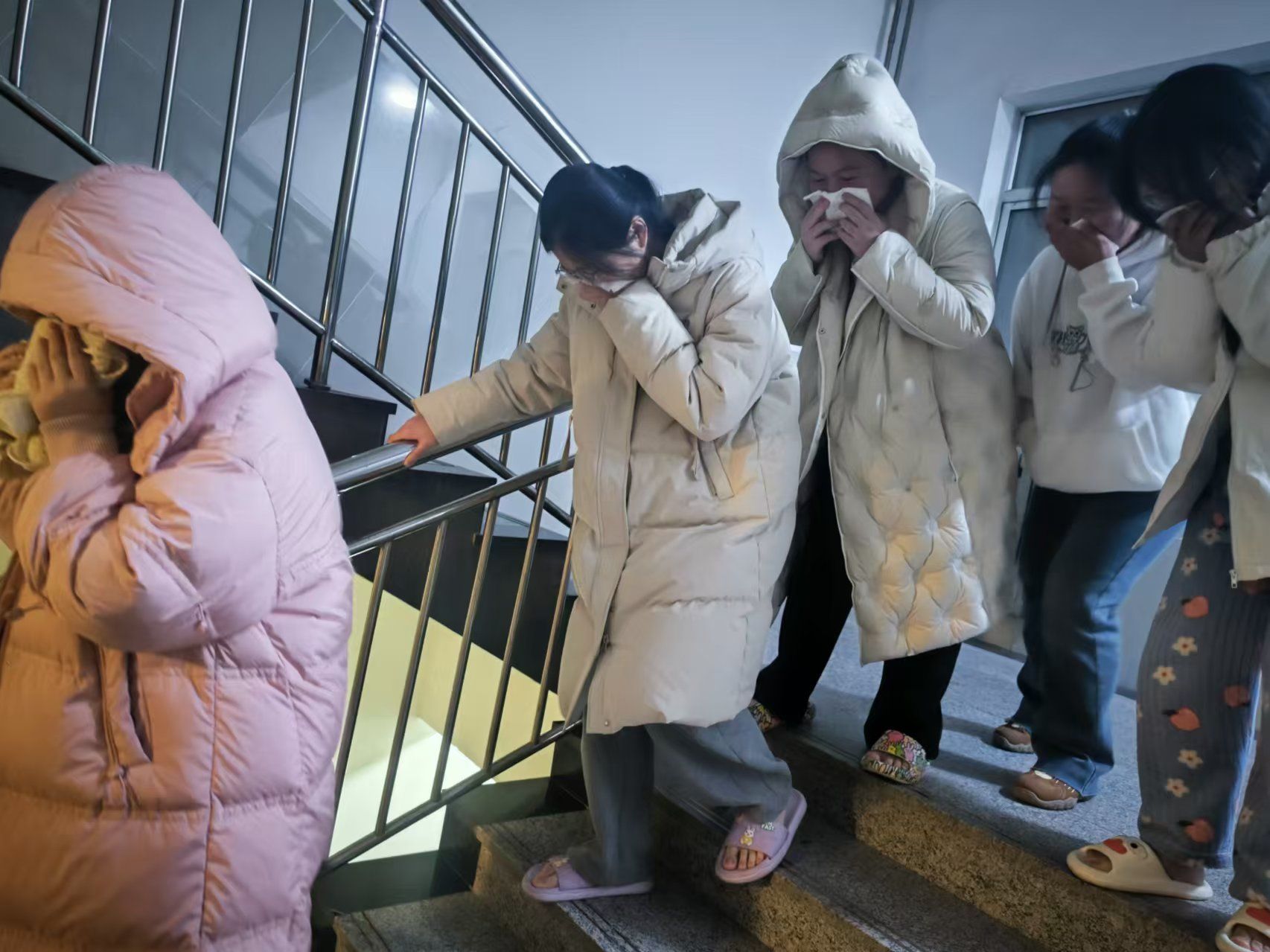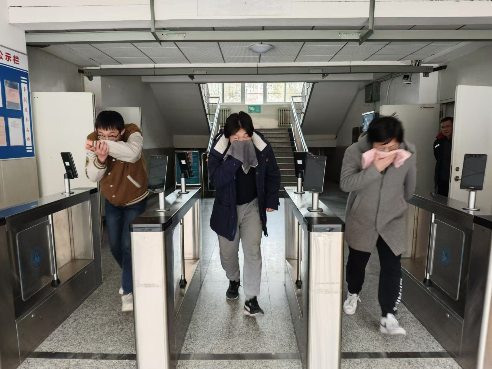 师生迅速反应,投入疏散行动。男生们展现出果敢与担当,互相提醒用湿毛巾捂住口鼻,或搀扶着行动稍缓的伙伴。女生们亦冷静有序,大家皆以湿毛巾捂口鼻,低姿依循疏散指示与引导员指引,稳步撤离。各楼层引导员坚守岗位,有力指挥,保障疏散过程快速且有条不紊。很快,全体人员安全抵达学 33 公寓后的空旷地集合,各班级精准清点人数并上报,整个疏散流程迅速有序,充分展现出师生良好的应急素养与平日演练成效。