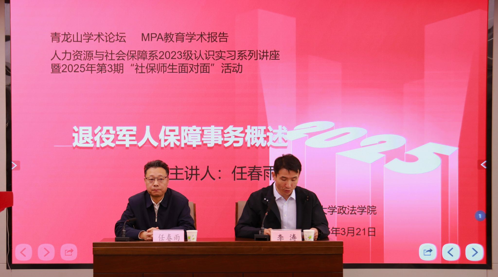 于第五学术报告厅举办了青龙山论坛暨人力资源与社会保障系2023级认识实习系列讲座,这也是2025年第3期“社保师生面对面”活动。本次活动有幸邀请到济南市退役军人事务局副局长任春雨,进行退役军人事务相关讲座。参加此次讲座的包括人力资源与社会保障系部分教师、2023级人社系本科生,以及部分专业的研究生。