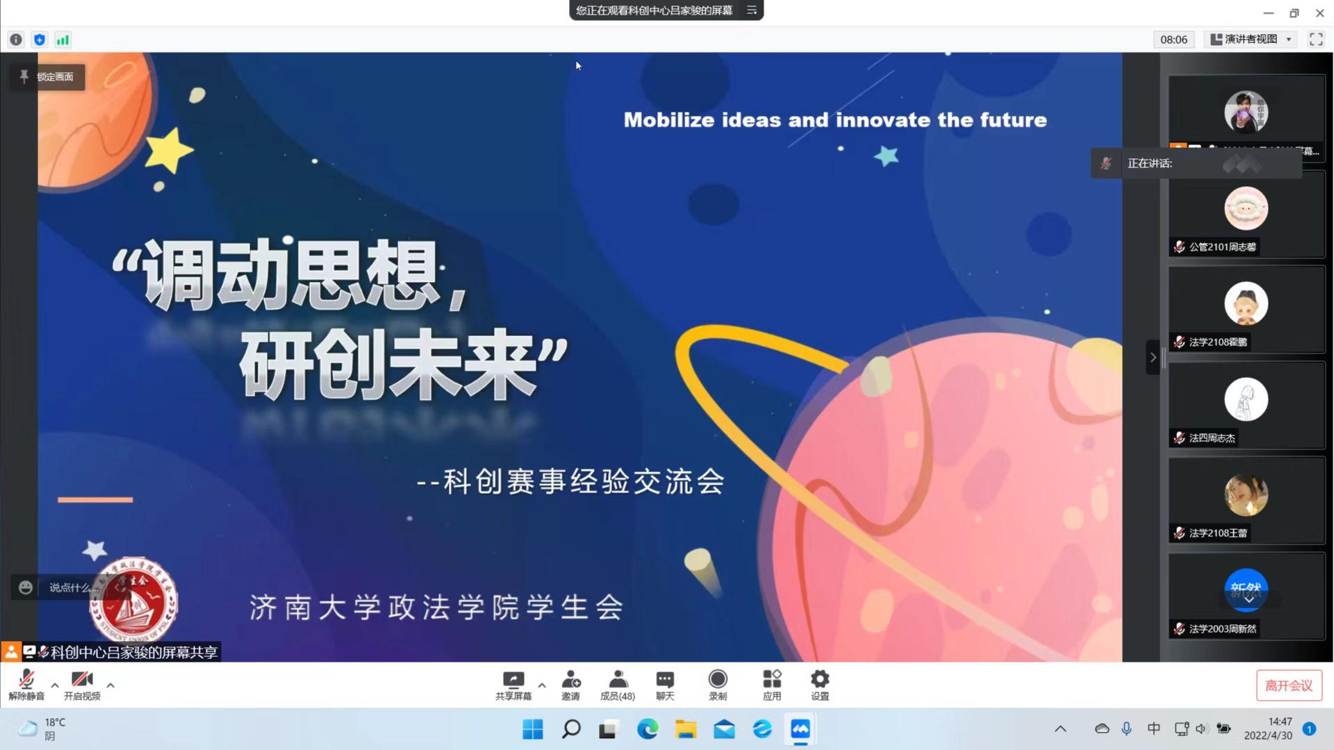 的科创工作有着积极的启发作用。基于项目寻找队员,专业知识有互补和吃苦耐劳又激情创新是王清华同学对我们构建团队的真诚建议,他认为“勤奋+专注”才是书山捷径,也是我们参与科创赛事应有的精神。活动最后是朋辈答疑环节,由两位嘉宾针对现场同学的疑问进行了系统、耐心的回答。这些建议深化了同学们对科创赛事的了解,增强了同学们积极参与科创赛事的信心和勇气。
