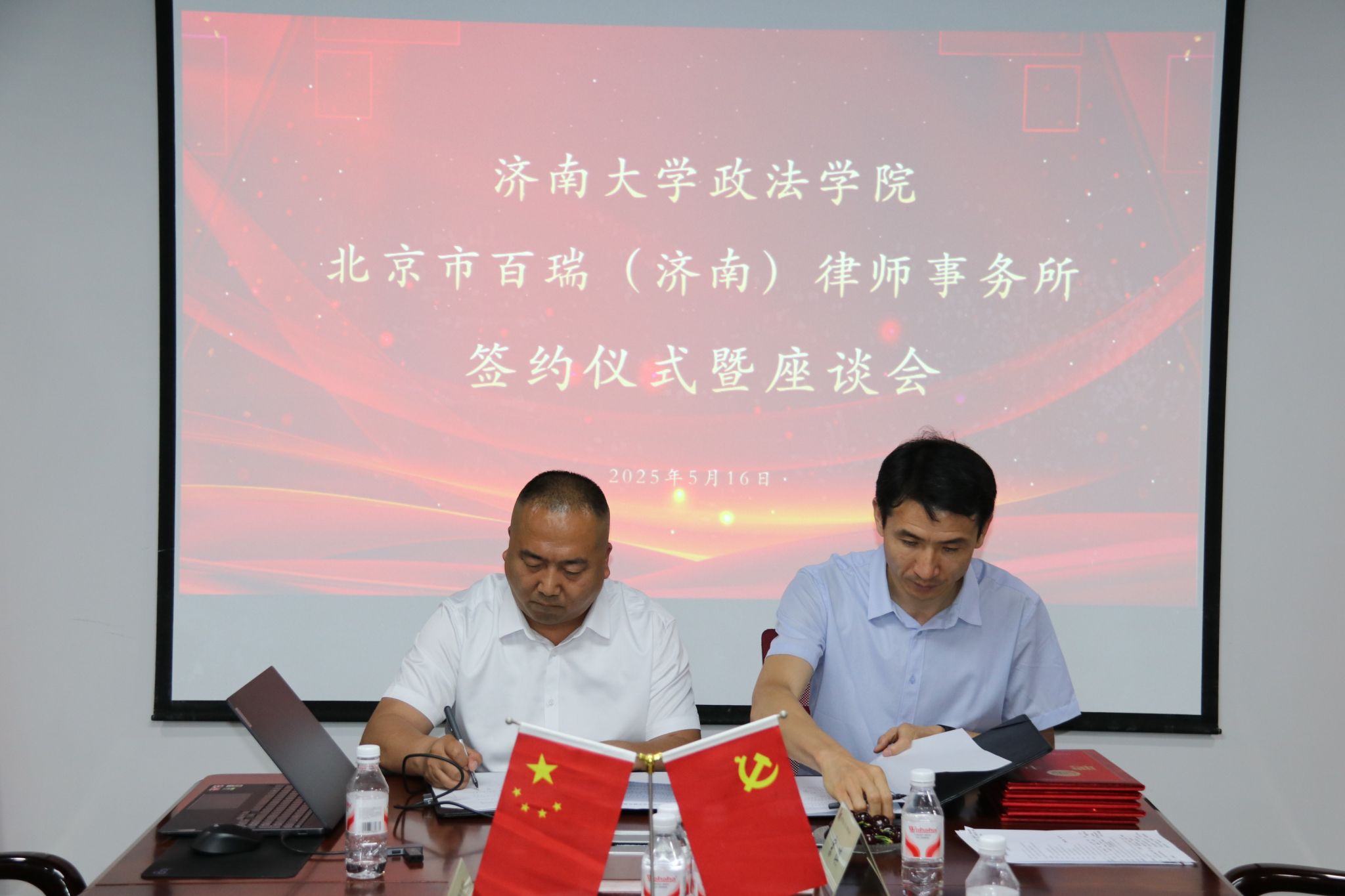 在与会人员的共同见证下,李涛与崔建国分别代表双方签署合作协议;李春慧与王晓明共同为“济南大学大学生就业创业实践基地”“济南大学毕业生就业基地”揭牌。根据协议,双方将在学生实习、就业指导、案例研究、学术交流等领域开展常态化合作。