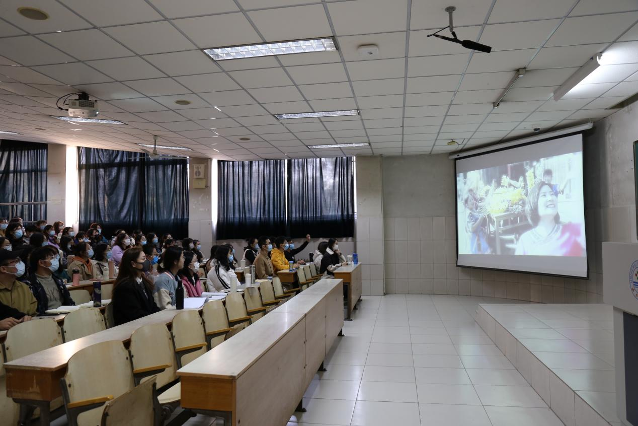 政治学系朱梅莹以《中国智慧助力全球治理变革》为主题,带领同学们用全球化的视野来看待中国的发展,讲述中国智慧如何在“百年未有之大变局”中为世界做出贡献,发挥中国在全球治理中作用与影响。在随后的影视教育环节中,同学们观看了《我们的脱贫故事》,同学们感叹于中国脱贫攻坚取得的成就,也明白脱贫攻坚的成果来之不易,向为中国脱贫攻坚做出贡献的人们致敬。