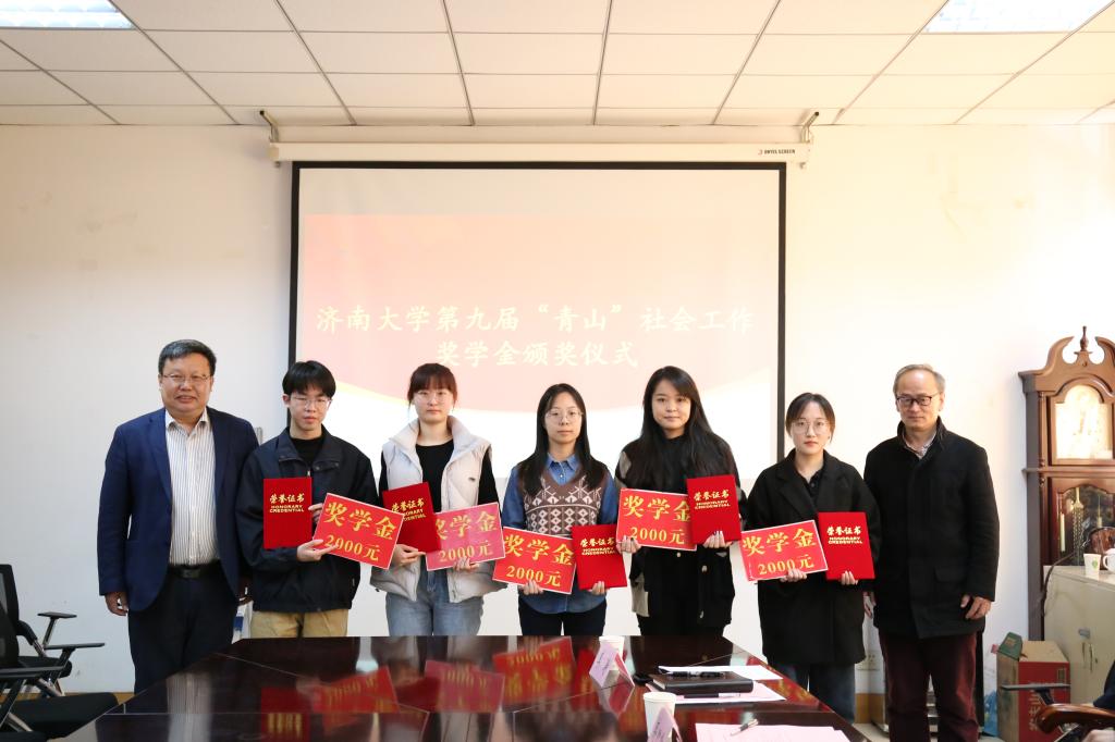 院长高功敬宣读了济南大学第九届“青山”社会工作奖学金表彰决定,与会嘉宾为获得第九届“青山”社会工作奖学金的时瑶瑶、崔佳、郭明瑞、姜姗、王坤杰、林晓晶、贾彤、余东剑、鲁琴和詹希怡同学颁奖。