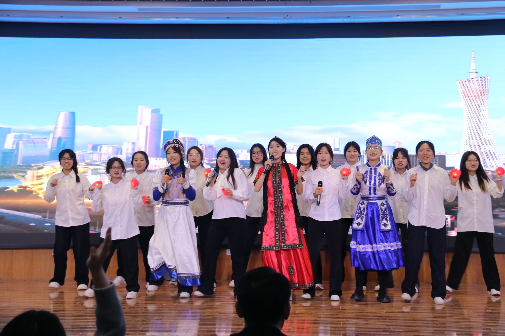 各学生组织带来的文艺节目环节,学生会带来的串烧歌曲《追梦》作为开场节目,惊艳亮场;心协带来的情景剧《民族情·剧暖心》从校园日常到历史瞬间,让我们感受各民族跨越时空的深厚情谊;青协献上节目《舞韵诵心·歌聚今朝》,当音符落下,舞姿定格的时刻,大家心中充满团结的温暖与激昂;记者团准备的手势舞《石榴籽·同心谣》,指尖传递温暖,手势里的民族团结情更打动人心;最后由自律会带来的一首耳熟能详的《相亲相爱》,唱出了大家庭的温暖,汇聚了各族师生携手并肩的深厚情谊。每一段舞蹈、每一首歌曲都是对民族文化的深情致敬,也是对民族团结的热烈颂扬。