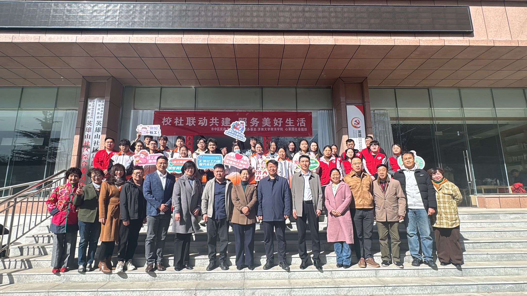 活动过程中,高功敬院长、张燕局长为济南大学实践教学基地揭牌。紧接着,张燕局长发表讲话,指出社会工作在基本民生保障、基层社区治理、基本社会服务等方面的专业优势和积极作用,对维护社区稳定、促进社区发展有着重要贡献,希望以此次校社联动为契机,探索社工人才培养新模式、新思路和新方向,共促社工事业发展。会议最后合影留念。