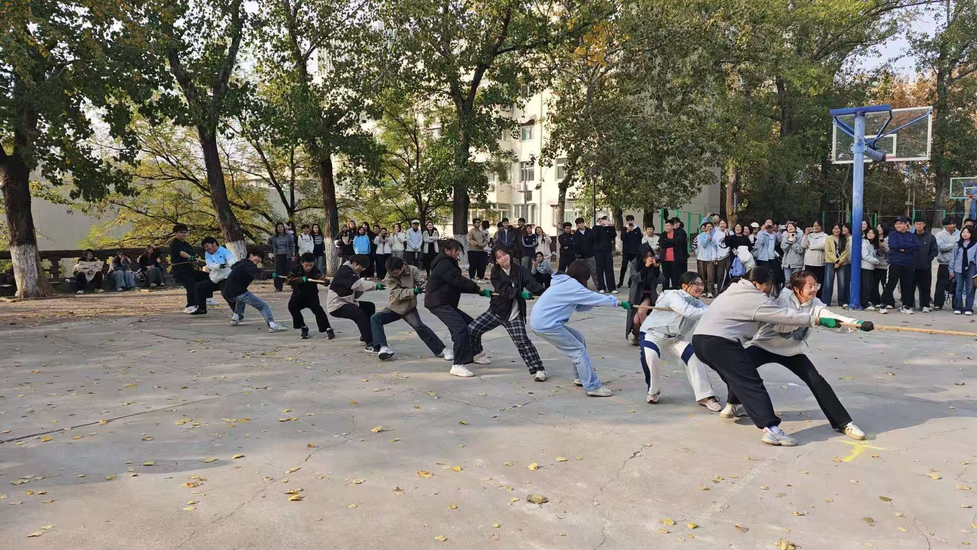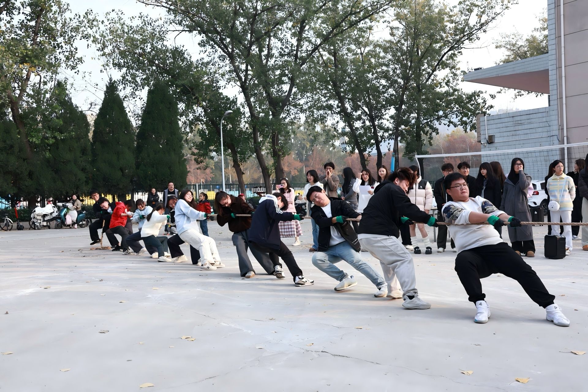 秋阳正好,赛场燃情。下午两点,比赛在裁判的哨声中正式开始。各班级代表队精神饱满、斗志昂扬,队员们紧握长绳、步调一致,在整齐的口号声中团结协作、全力以赴;场外师生热情助威,掌声与呐喊此起彼伏,充分展现了政法学子积极向上、勇于拼搏的精神风貌。整场比赛组织有序、气氛热烈,本着“友谊第一,比赛第二”的原则,让同学们在活动中深化友谊、感受集体力量,将拼搏精神融入日常学习与生活。