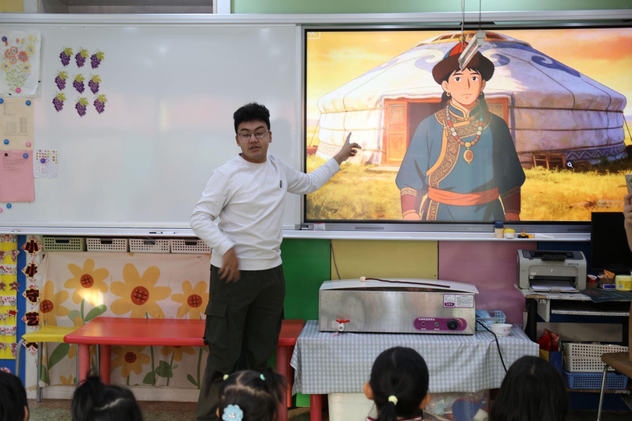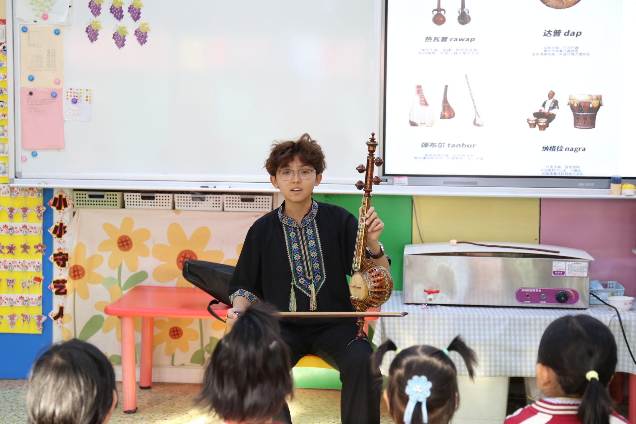 实践团成员围绕“认识少数民族”“了解少数民族风俗习惯、特色美食、传统乐器与歌舞”等主题各展所长,将民族团结理念融入生动活泼的教学环节,为幼儿带来了丰富精彩的教育体验。队员们充分调动幼儿学习的积极性与主动性,引导孩子们在玩中体验、在乐中感悟、在互动中学习。志愿者们分组开展活动:教小朋友们跳民族舞蹈、学说简单的民族语言、体验弹奏民族乐器等。石榴树下,大手牵小手共舞共学,掌心相触的温度让 56 个民族的团结故事悄然萌芽。一张张真诚的笑脸、一双双挥动的小手、一阵阵灵动的旋律,构成了各民族交往交流交融最动人的画面。这一刻,不同民族同心同向,“大学生” 与 “小朋友” 的距离也在欢声笑语中不断拉近。