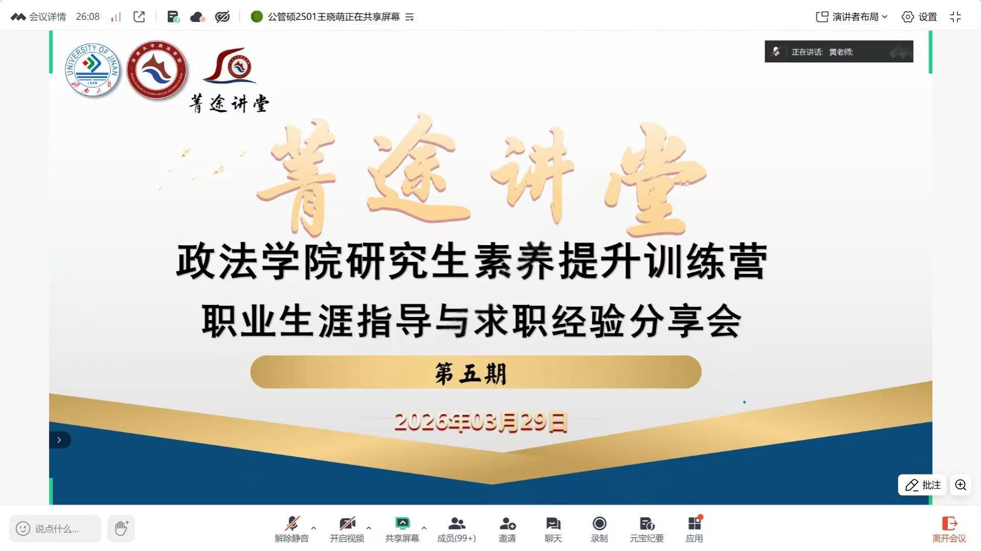 学办主任、研究生辅导员黄茜老师向三位校友致以诚挚谢意,着重强调了职业生涯规划对研究生成长成才的重要意义。她表示,面对多元的职业选择与竞争环境,精准的备考指导和实用的经验分享,能帮助同学们避开备考误区、少走弯路,希望全体参会同学珍惜此次学习机会,认真汲取前辈经验,明确自身职业定位,做好职业规划。