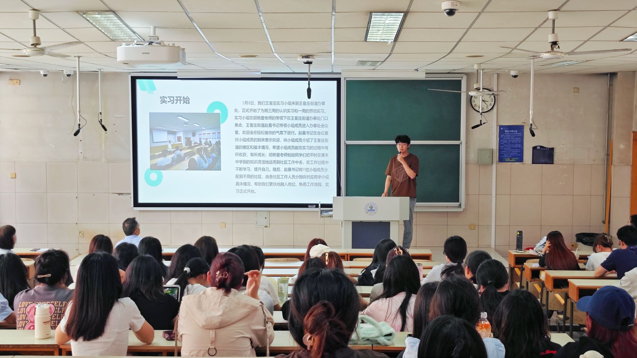 会上,首先由2021级学生代表高霞、陈星宇、孔谦三位同学作了实习经验分享。高霞同学通过个人经历向学弟学妹们叮嘱工作注意事项、学习导向以及人际交往方面的建议,希望同学们秉承严谨、认真、负责、耐心的态度投入实习,一以贯之,严于律己,展现出政法学子的优良风采。陈星宇同学介绍了市中区十六里河街道的基本情况以及工作任务,总结并分享自身的感悟收获,叮咛同学们要认真履职尽责,练就过硬本领。孔谦同学回顾了在王官庄街道的实习经历,分享社区电话回访、安全走访等方面的工作经验,建议大家秉持问题意识,积累案例素材,不虚此行,不负众望。