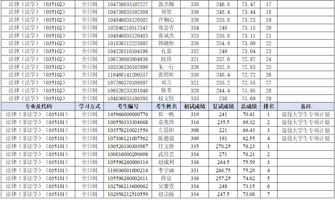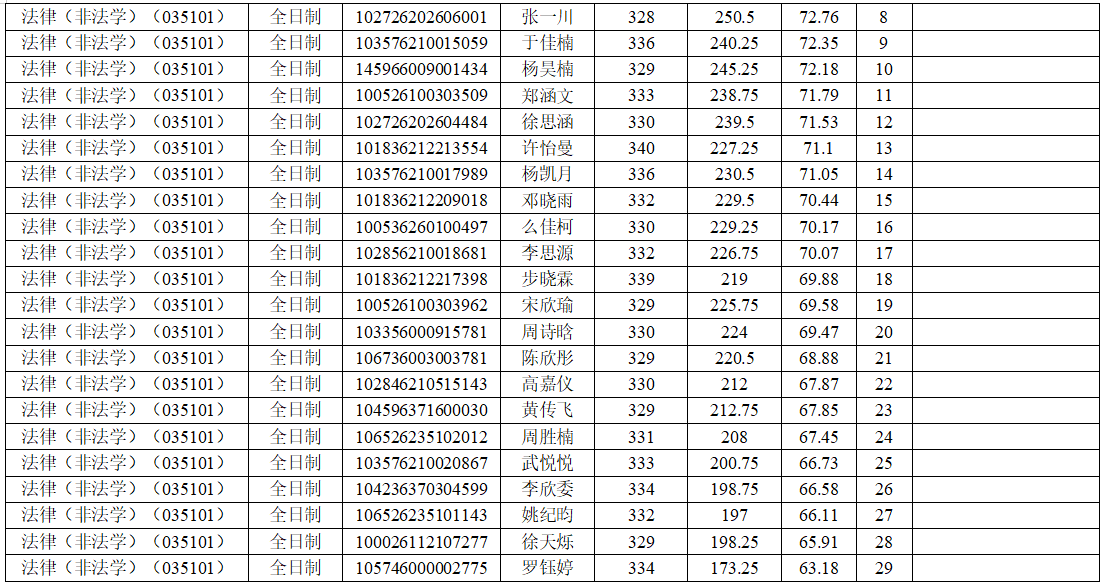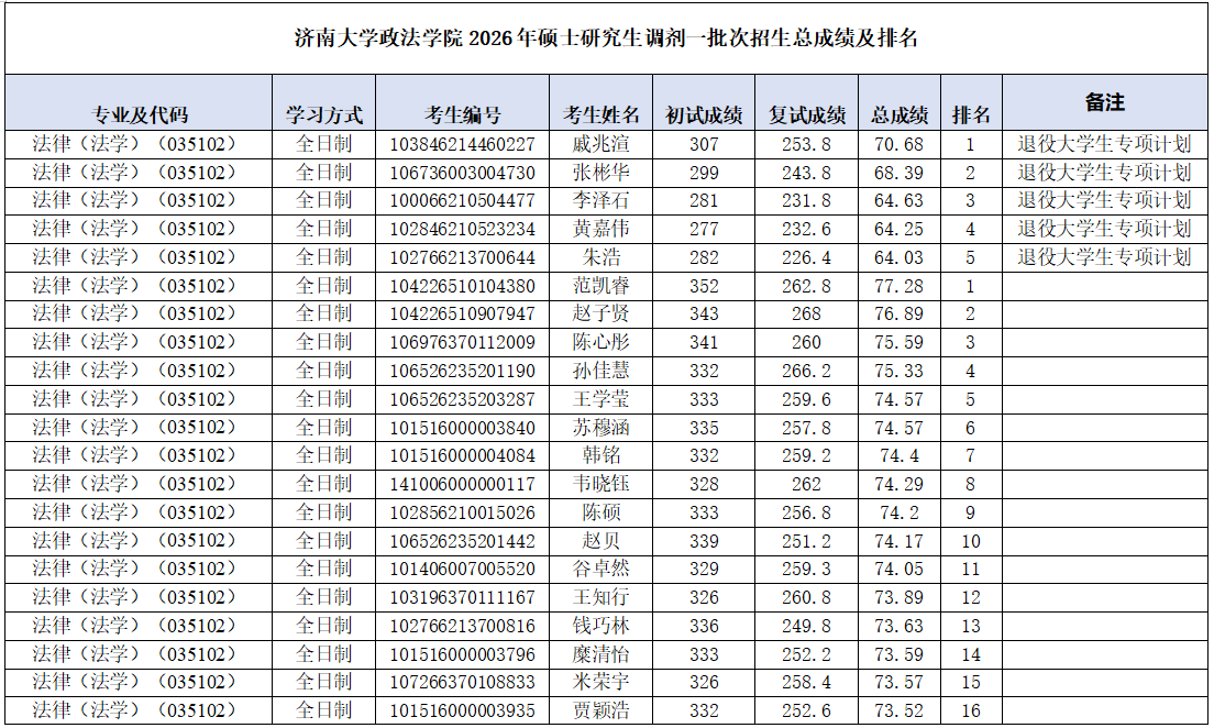 于2026年4月9日进行了法律(法学)(035102)、法律(非法学)(035101)硕士研究生招生调剂志愿一批次复试工作。现将考生成绩及排名予以公示。