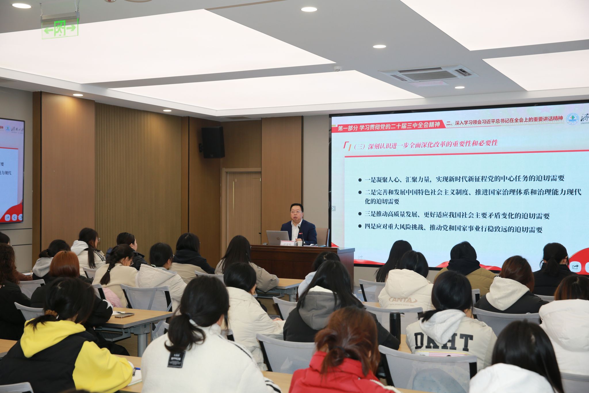 课堂上,刘宗明校长系统讲解了党的二十届三中全会的重大时代意义、《中共中央关于进一步全面深化改革、推进中国式现代化的决定》提出的进一步全面深化改革重大举措,特别是关于统筹推进教育科技人才体制机制一体改革的新部署新要求,深刻阐释了习近平总书记关于全面深化改革的一系列新思想、新观点、新论断。他指出,党的二十届三中全会是新的历史起点上进一步全面深化改革、推进中国式现代化的总动员、总部署,是面对纷繁复杂的国际国内形势,面对新一轮科技革命和产业变革,面对人民群众新期待召开的一次重要会议。同时,他结合学生专业实际,勉励同学们要坚定理想信念,切实以习近平新时代中国特色社会主义思想凝心铸魂,展示新时代青年的良好风貌,凝聚推进中国式现代化的青春力量。