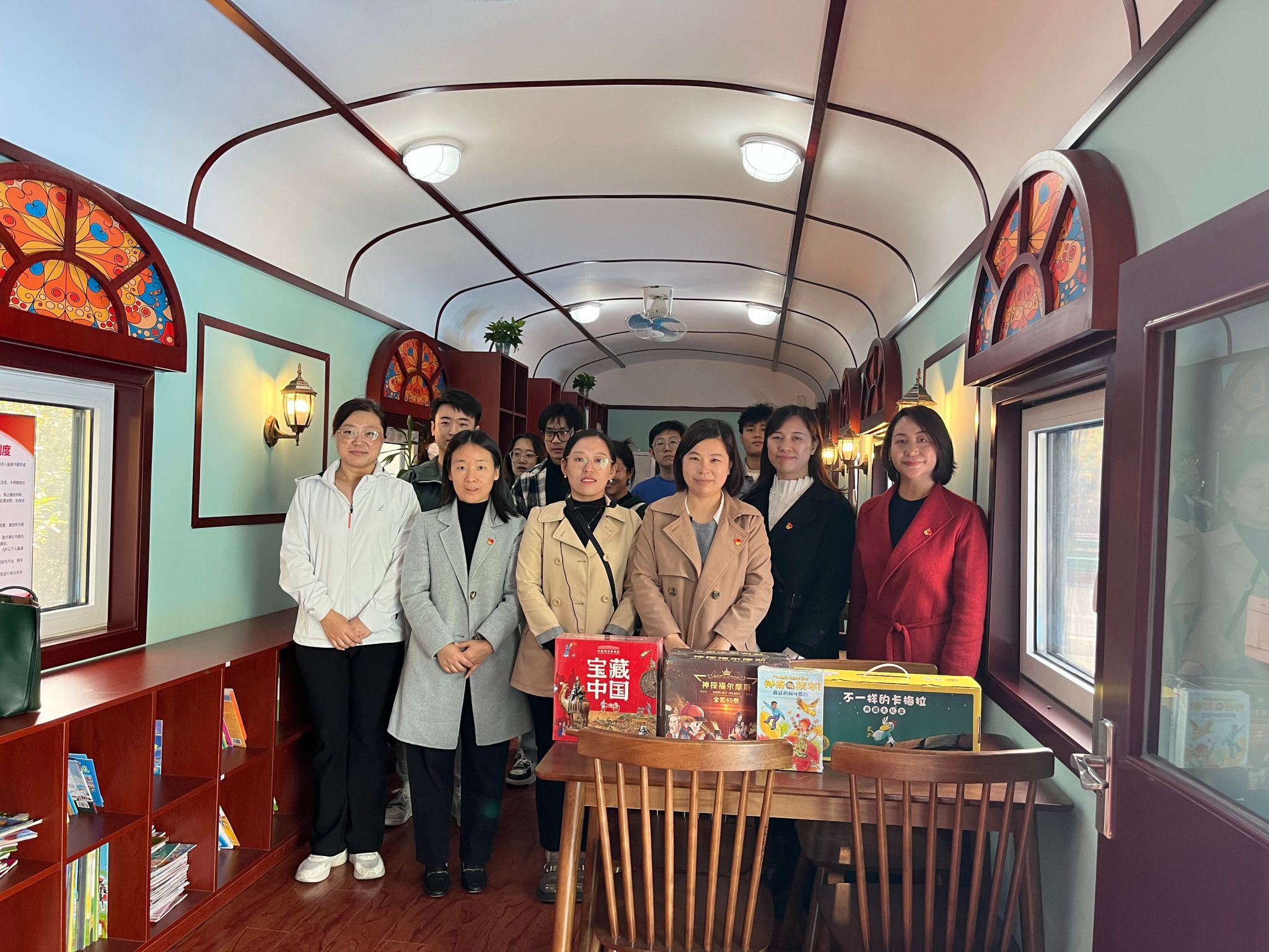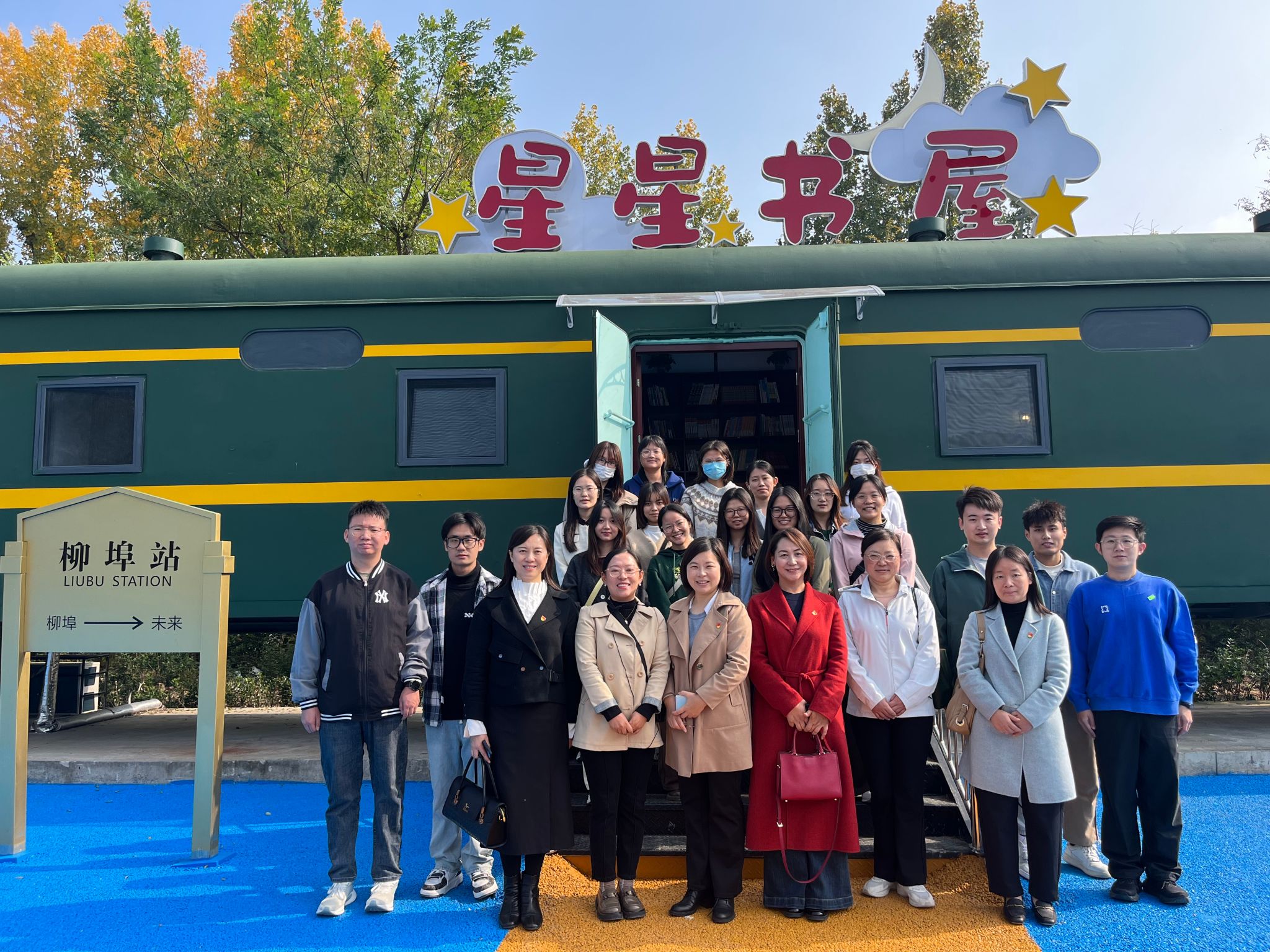 紧接着,师生一行来到柳埠镇星星书屋,这是由社会各界及爱心人士捐赠建立的公益火车书屋。柳埠街道文化服务中心主任许娜详细介绍了“星星书屋”的创建目的、过程、藏书数量以及未来发展规划。师生们对星星书屋的公益行动给予了高度评价,人社系党支部书记辛瑞萍代表党支部向星星书屋捐赠了图书、绘本两百余册,并表示将继续为孩子们提供更多的成长支持。